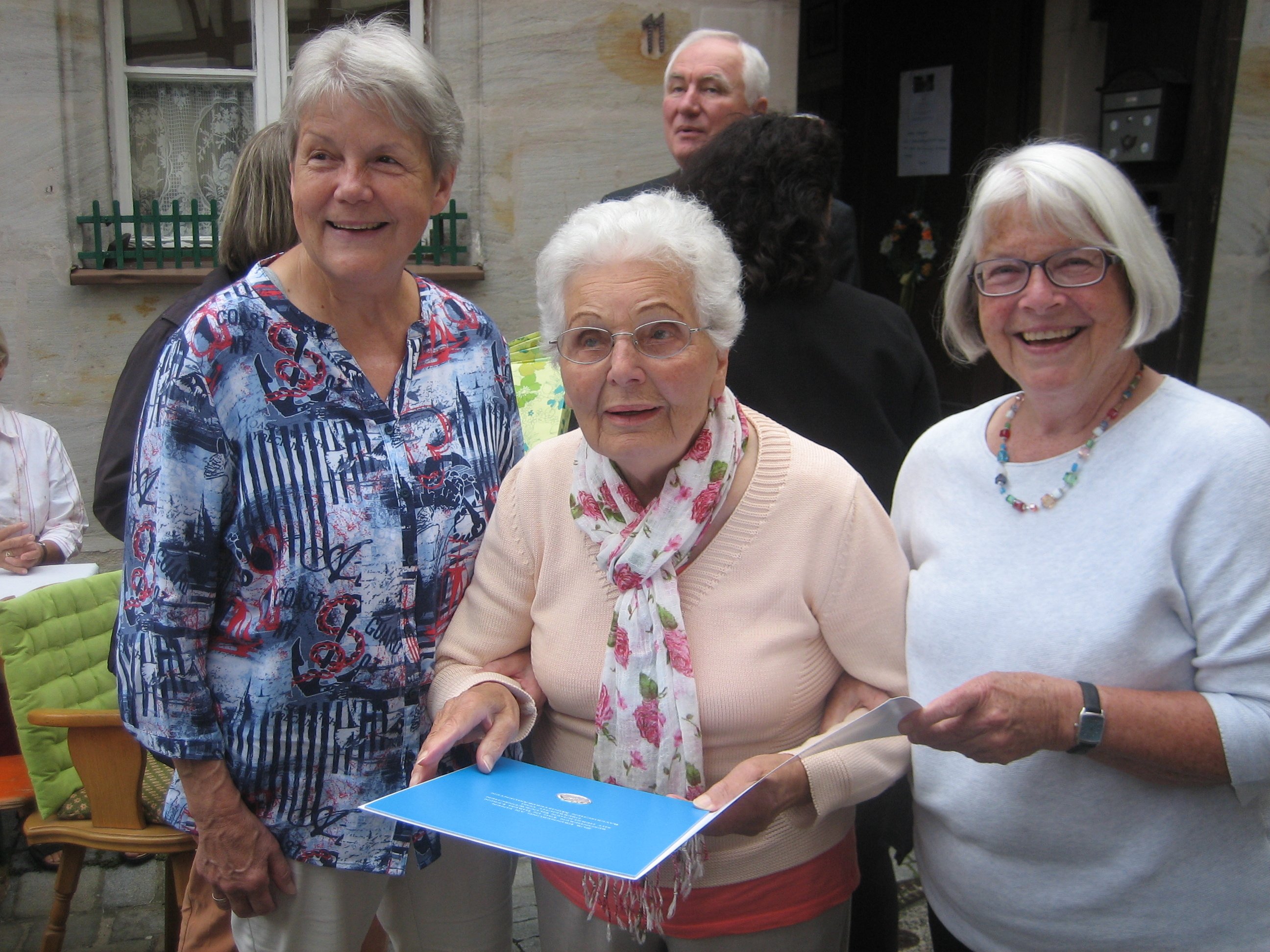 Die Wünsche und Grüße der Stadt Altdorf überbrachte dritter Bürgermeister Dr. Johann Peter Poellot, der Urkunde und Geschenkkorb überreichte. Außerdem hatte er die Glückwunschurkunde des Bayerischen Ministerpräsidenten Seehofer mit einer Medaille der Patrona Bavariae für die Jubilarin dabei. Mit Segenswünschen und einem Lied gratulierte Pfarrerin Gabriele Meyer von der Evangelischen Kirchengemeinde. Christine Seichter, die Vorsitzende des Evangelischen Frauenbunds Altdorf war mit einem Team gekommen, um das älteste, aber sehr rüstige Mitglied des Vereins zu honorieren.