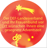 Im November wurde klar, dass die Ortsverbände und Anschlussvereine, aber auch der Landesverband auf Weihnachtsfeiern oder andere Veranstaltungen im Advent, auf der sich die Mitglieder wahrhaftig begegnen können, verzichten müssen. Um aber dennoch mit den Mitgliedern in der Adventszeit in Kontakt zu bleiben, wollen viele Verantwortliche in diesen herausfordernden Zeiten mit coronabedingten Kontaktbeschränkungen einen persönlichen Gruß an die Mitglieder senden oder verteilen. Damit ein möglicher Brief oder ein kleines Geschenk, das den Mitgliedern, Gästen und Förderern übergeben werden soll, eine noch persönlichere Note erhält, sind DEF-Weihnachtsaufkleber gestalten worden. Sie sind 4cm im Durchmesser und können auf jeden Briefumschlag oder jedes Päckchen geklebt werden. Bei Bedarf können diese in der Geschäftsstelle bestellt werden.