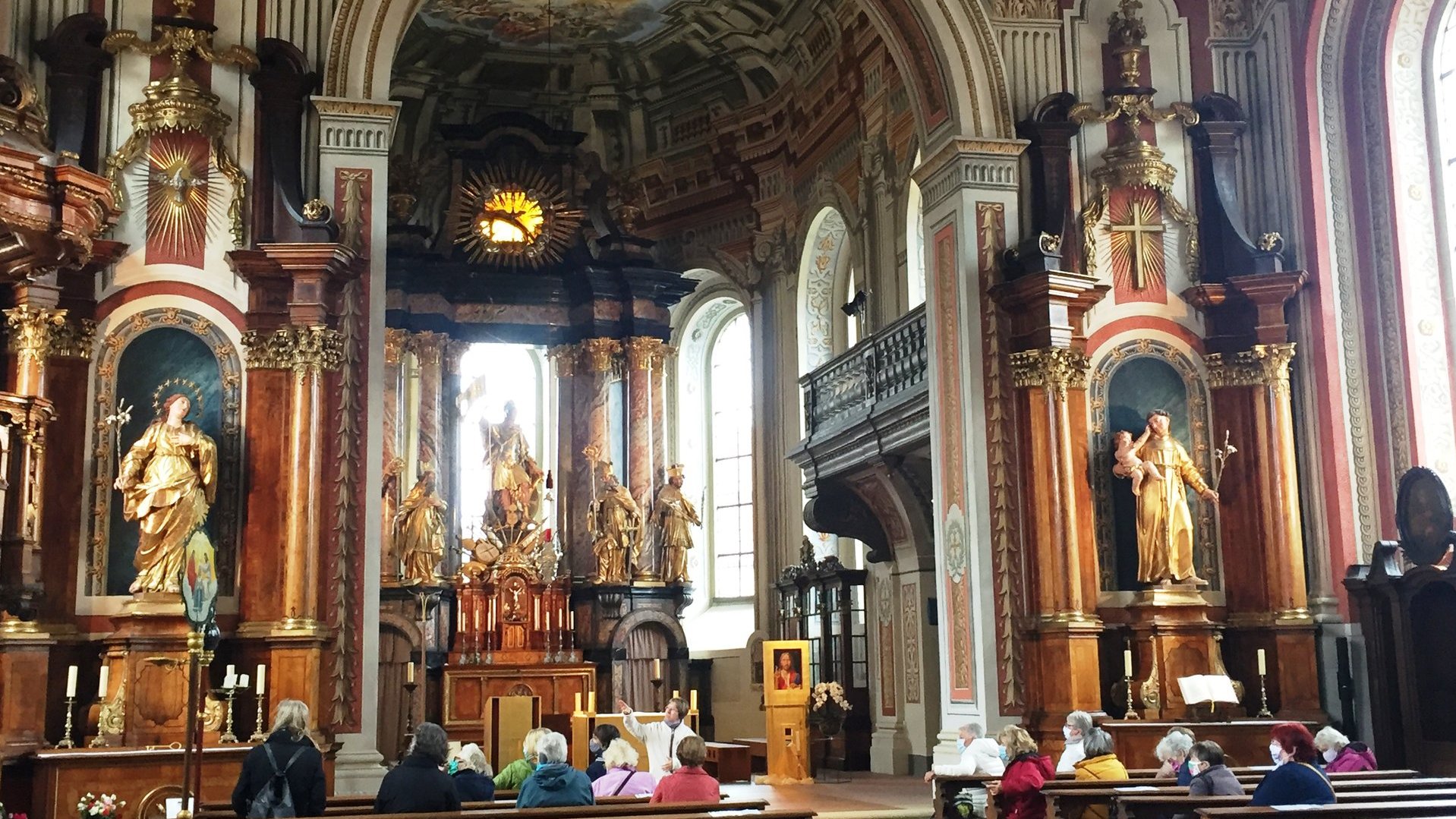 In Wiesentheid, der ersten Station, stand die katholische Mauritiuskirche, die seit 2018 in ihrem barocken Kleid wieder voll erstrahlt, auf dem Führungsprogramm. Die Grafen von Schönborn hatten nicht nur den Ortskern durch ihre Residenz, die sie hier errichteten, geprägt, sondern auch die Kirche. Durch die Mitwirkung von Balthasar Neumann und Baumeister Johann Georg Seitz wurde die Kirche zu einem Gesamtkunstwerk. Im Innern führt die Frescoausmalung durch den Italiener Giovanni Emanuel Marchini zu einer besonderen Ausstrahlung. Immer wieder wird dem Betrachter, gleichgültig wo er seinen Standpunkt hat, die Illusion vermittelt, er stünde unter einer großen Kuppel, die aber in Wirklichkeit nicht existiert. Der Standpunkt des Betrachters bestimmt die Perspektive.