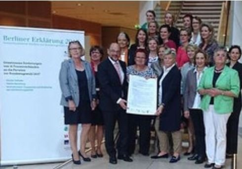 Pressemitteilung des Deutschen Frauenrates, Montag, 12. Juni 2017Autorin: Ulrike HelwerthBild: Deutscher Frauenrat, Vertreterinnen der Berliner Erklärung mit dem SPD-Kanzlerkandidatenhttps://www.frauenrat.de/no_cache/deutsch/infopool/nachrichten/informationdetail/article/erstes-treffen-mit-spitzenkandidatinnen-erfolgreich.html