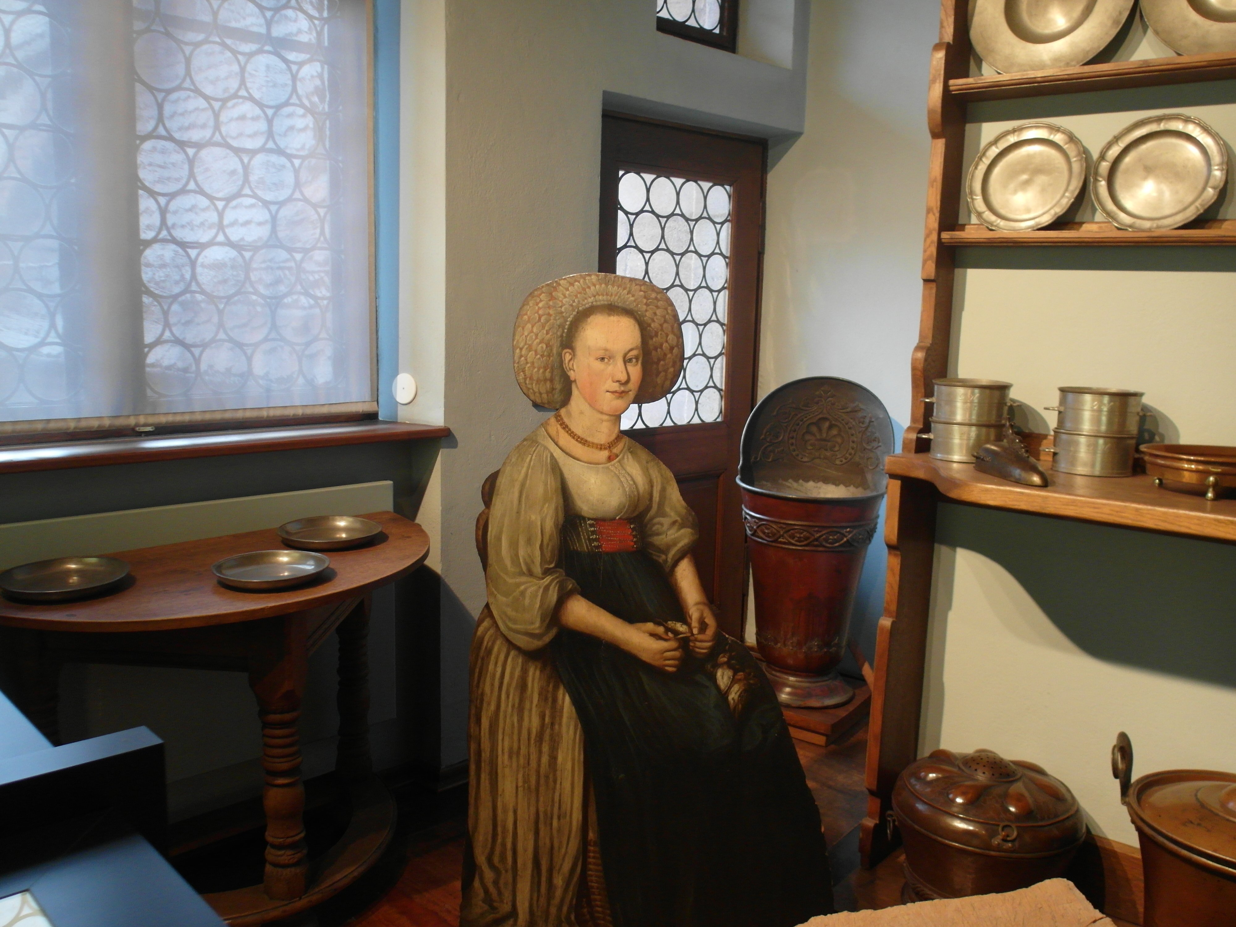 Die praktische Seite lässt sich in einer großen Küche mit mächtigem Rauchfang imaginieren. Verschiedene langstielige Pfannen warten dort in ihren Gestellen auf einen Einsatz, der ja doch nicht mehr kommen kann. Überall gibt es Zinnteller, statt des Porzellans, von dem heute jeder essen kann. Damals war es unerschwinglich und nur hohen Herrschaften vorbehalten. Die vielen Armen haben sowieso von Holztellern und -schüsseln gegessen. Die Zinnteller sind aber auch noch in Gebrauch, in Traditionslokalen der Altstadt werden darauf die kurzen Nürnberger Bratwörscht mit Kraut serviert. Auch Steingutgeschirr findet sich im Fembohaus, wie es im 18. Jh. dem höfischen Porzellan nachgebildet in Blauweiß produziert wurde. Na, das war schon eine Küche für einen bessergestellten städtischen Haushalt. Es sitzt auch eine Frau drin auf einem Hocker, mit einer großen Schürze über ihrem weiten Gewand. Eine aus unserer Gruppe hat gedacht, die ist echt, eine Frau eben im historischen Gewand. Aber nein, sie ist eine Pappmamsell.