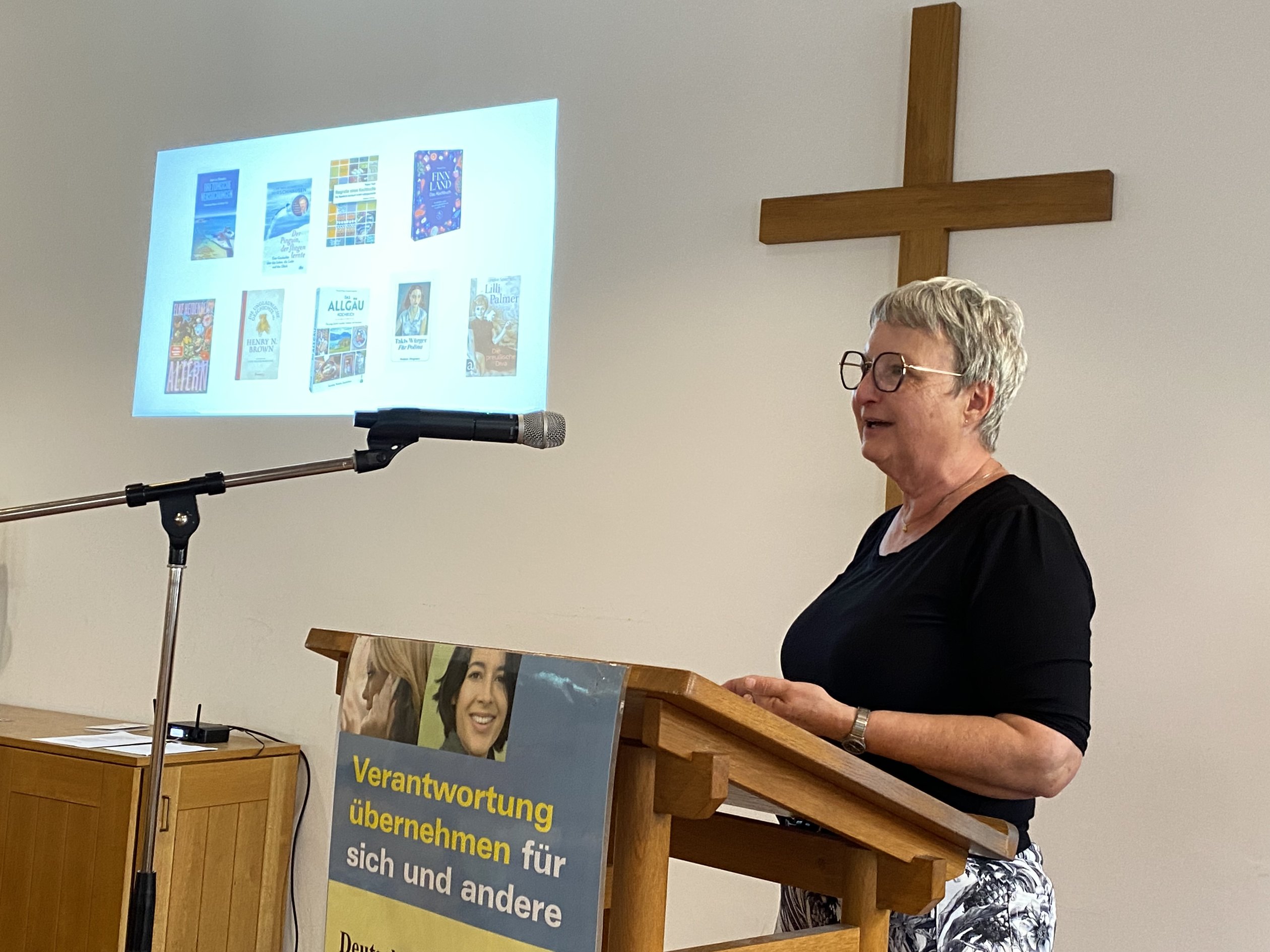 Die letzte Folie zeigte die Gestaltung heutiger Buchtitel, die im Herbst auf dem Programm zur Vorstellung im Literaturkreis warten. Mit folgendem Zitat schloss der Vortrag: