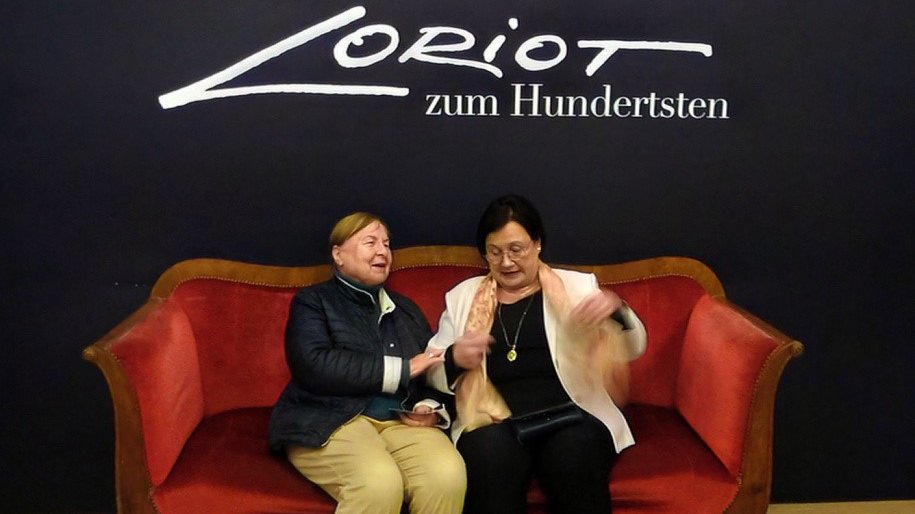 Das rote Sofa, von dem aus Evelyn Hamann und Loriot ihre Sketche in den Medien präsentierten, lud in der Ausstellung zum Probesitzen ein. Obwohl schon etwas durchgesessen, haben es sich die beiden Damen des DEF, Karin Klein und Barbara Jacob, nicht nehmen lassen, auf selbigem Platz zu nehmen.