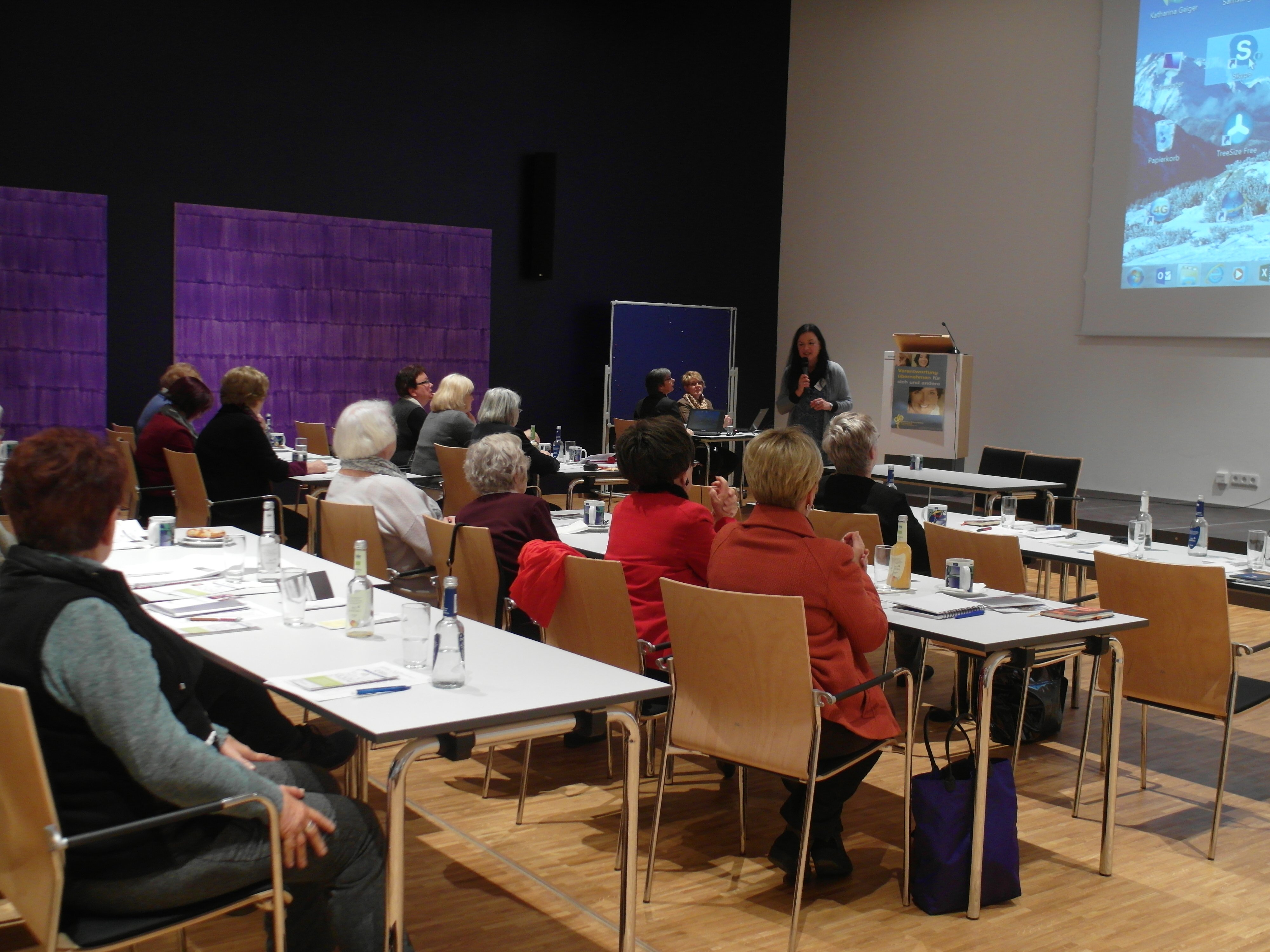 Geschäftsführerin Katharina Geiger ergänzte an beiden Dialogtagen die Ausführungen der Vorsitzenden und berichtete ihrerseits aus der umfangreichen Gremienarbeit in der EFB, dem Rundfunkrat, Landesfrauenrat u.v.a.m. Die Zeiten sind für die Frauenverbände insgesamt, auch die kirchlichen, schwierig, denn sie müssen um ihre Rolle in den Gremien kämpfen. Sie geben aber den Frauen eine Stimme, wo gerade die Tendenz, nicht mehr zuzuhören, sich bemerkbar macht. Der DEF ist dabei insbesondere auch mit seinem viel beachteten und hochgelobten Magazin def aktuell gut aufgestellt. Es ist ein ausgezeichnetes Material der Werbung für Inhalte und den Verband, und Katharina Geiger rief zu fleißiger weiterer Beteiligung daran durch Berichte und Fotos auf. Auch forderte sie die Ortsverbände auf, das Haus für Mutter und Kind in Fürth zu unterstützen, durch Mitgliedschaft des OV und von Einzelpersonen und Spenden. Dieses Haus ist ein Sozialprojekt des gesamten Verbands und sollte allen am Herzen liegen. Ein anderer Kristallisationspunkt des DEF ist das Haus am Kufsteiner Platz in München, das Wohnung für 120 Frauen bietet und Sitz der Landesgeschäftsstelle ist. Dort stehen in diesem Jahr die Sanierung des Hinterhofes und der Einbau eines behindertengerechten neuen Aufzugs an.