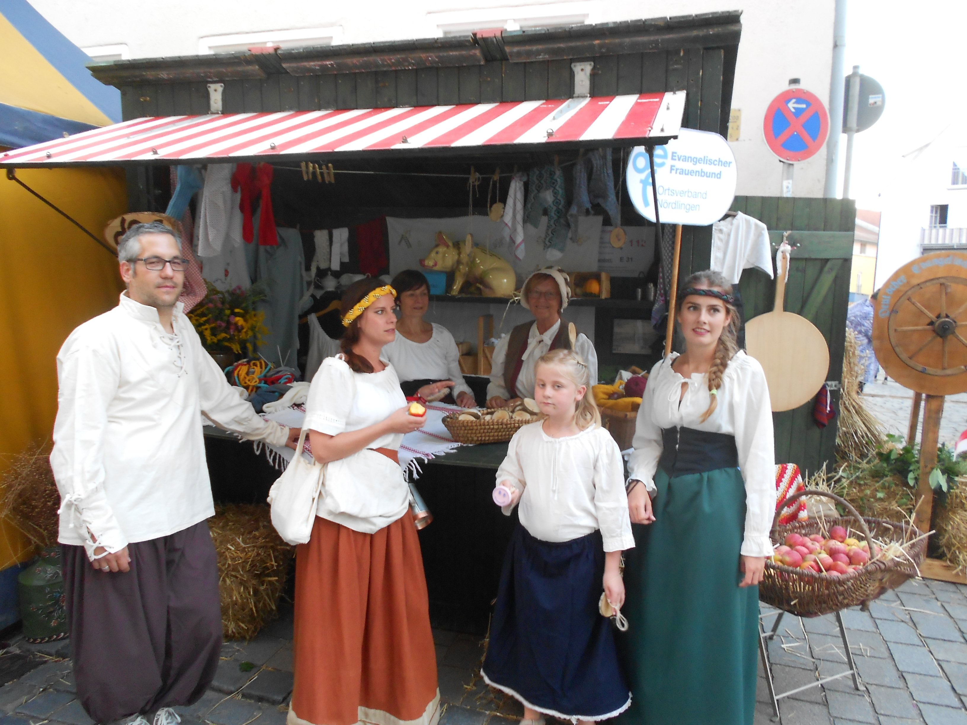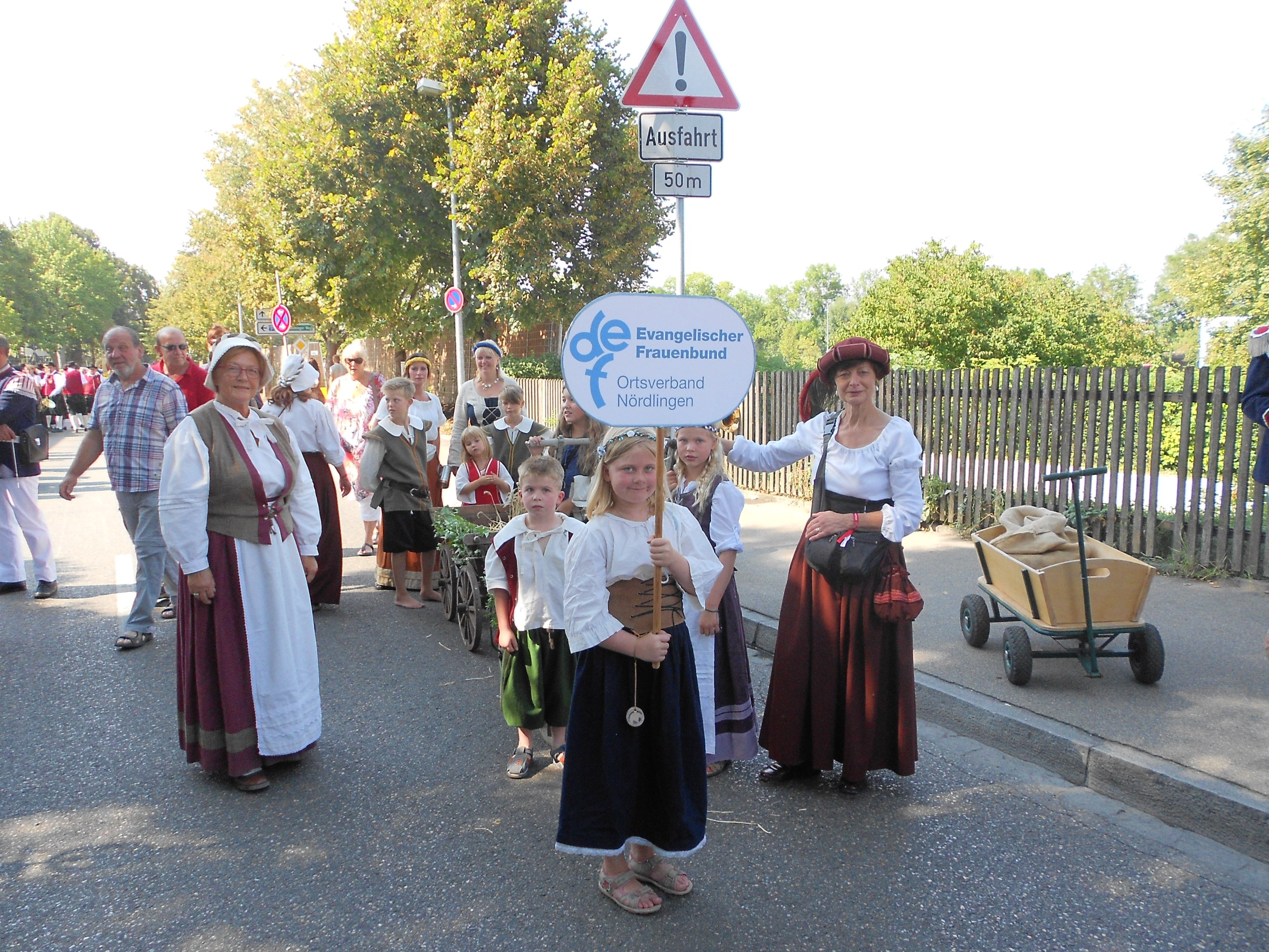 Der Deutsche Evangelische Frauenbund OV Nördlingen beteiligte sich zum ersten Mal am Stadtmauerfest.Einige Mitglieder beteiligten sich samt Kinder und Enkelkinder auch am Brauchtumsumszug.