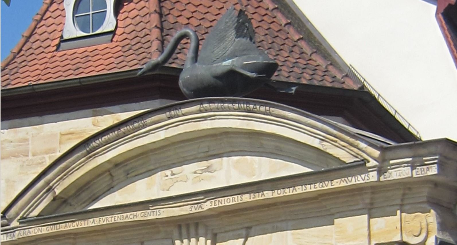 Torbogen des Barockportals mit Inschrift und dem Schwan