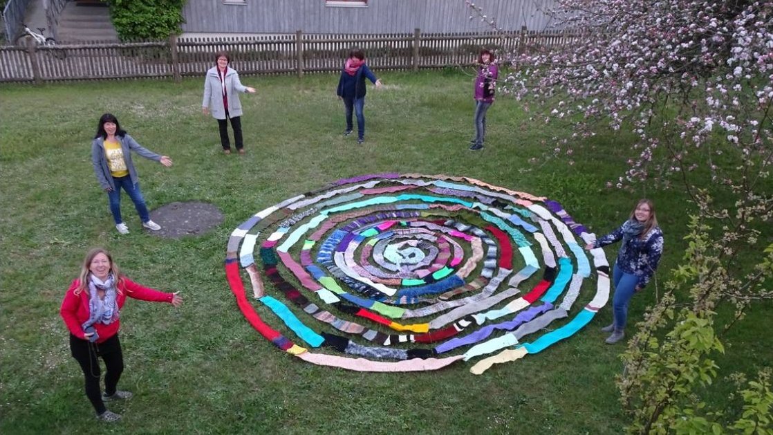 Foto: Fleißige Strickerinnen und ihre "Schalschnecke", über 100 m lang. Quelle: privat