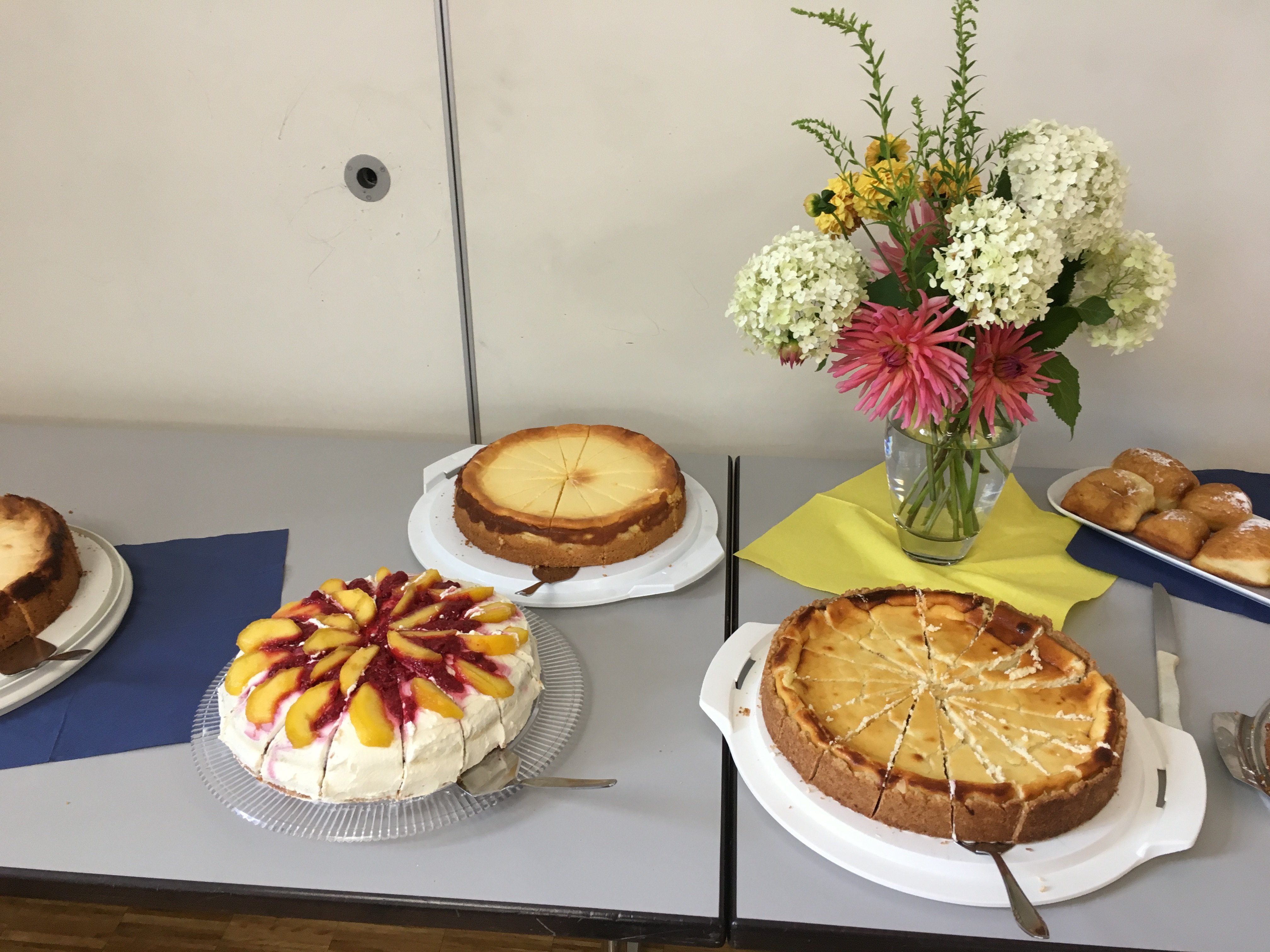 Zu schade zum Aufessen, zu schade zum nur Anschauen. Also dankte die Vorsitzende Johanna Drechsel den Kuchenbäckerinnen für das schöne und üppige Kuchenbuffet zum Sommerfest des Frauenbunds Schwabach. „Schau an der schönen Gärten Zier, und siehe, wie sie Dir und mir sich ausgeschmücket haben“, lobt schon Paul Gerhardt in seinem berühmten Sommerlied. und wie schon Eichendorff im Volkslied von den Lerchen meint „Was sollt’ ich nicht mit ihnen singen, mit voller Kehl und frischer Brust?“, so sangen alle tüchtig mit bei der Unterhalterin Elke Winkler mit ihrem Akkordeon, die musikalisch durch den Nachmittag unter dem Motto „So klingt’s bei uns“ führte. Es wurden viele Sommerlieder gesungen, geschunkelt, kleine Geschichten und Gedichte vorgetragen. Wer in der Zeit seit dem letzten Treffen der Schwabacherinnen Geburtstag gehabt hatte, dem wurde mit dem Kanon „Viel Glück und viel Segen“ gratuliert.