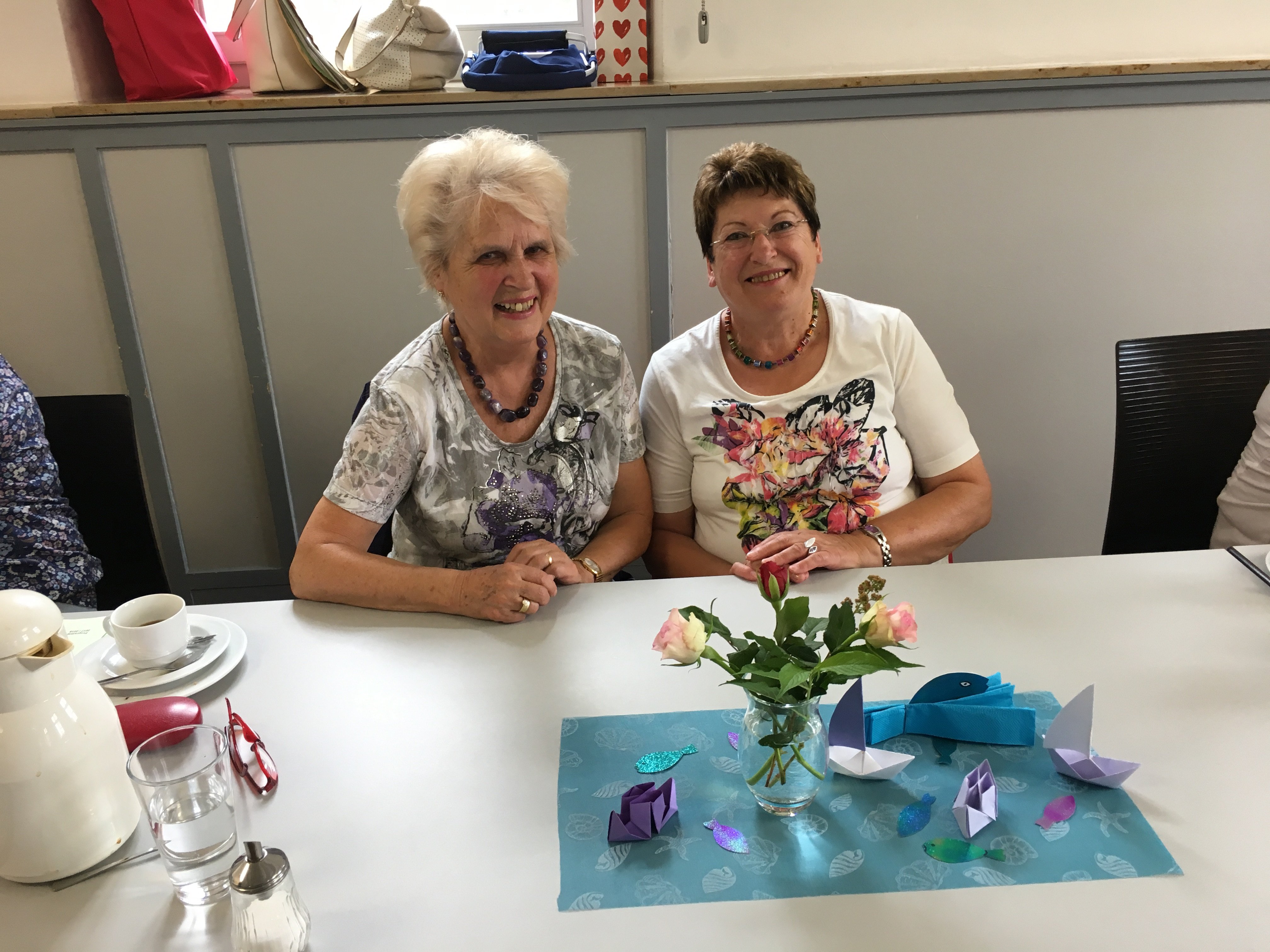 Im Sommer springen auch die Fische aus dem Wasser, und andererseits führt vielleicht manch eine ihre sommerliche Urlaubsfahrt ans Meer. Darauf nahm die Tischdekoration von Christa Theel Bezug: Auf je einem blaugrünen Stofftuch mit eingewebten Muschelmotiven schwammen kleine bunt schillernde Fischlein, obendrauf eine Flottille von gefalteten Papierschiffchen, eines mit einem blauen Segel. Sogar ein lila Dampfer mit zwei Rohren fuhr über dieses Meer. Und aus einem Wellenberg aus gefalteten Servietten schaute ein blauer Walfisch hervor.