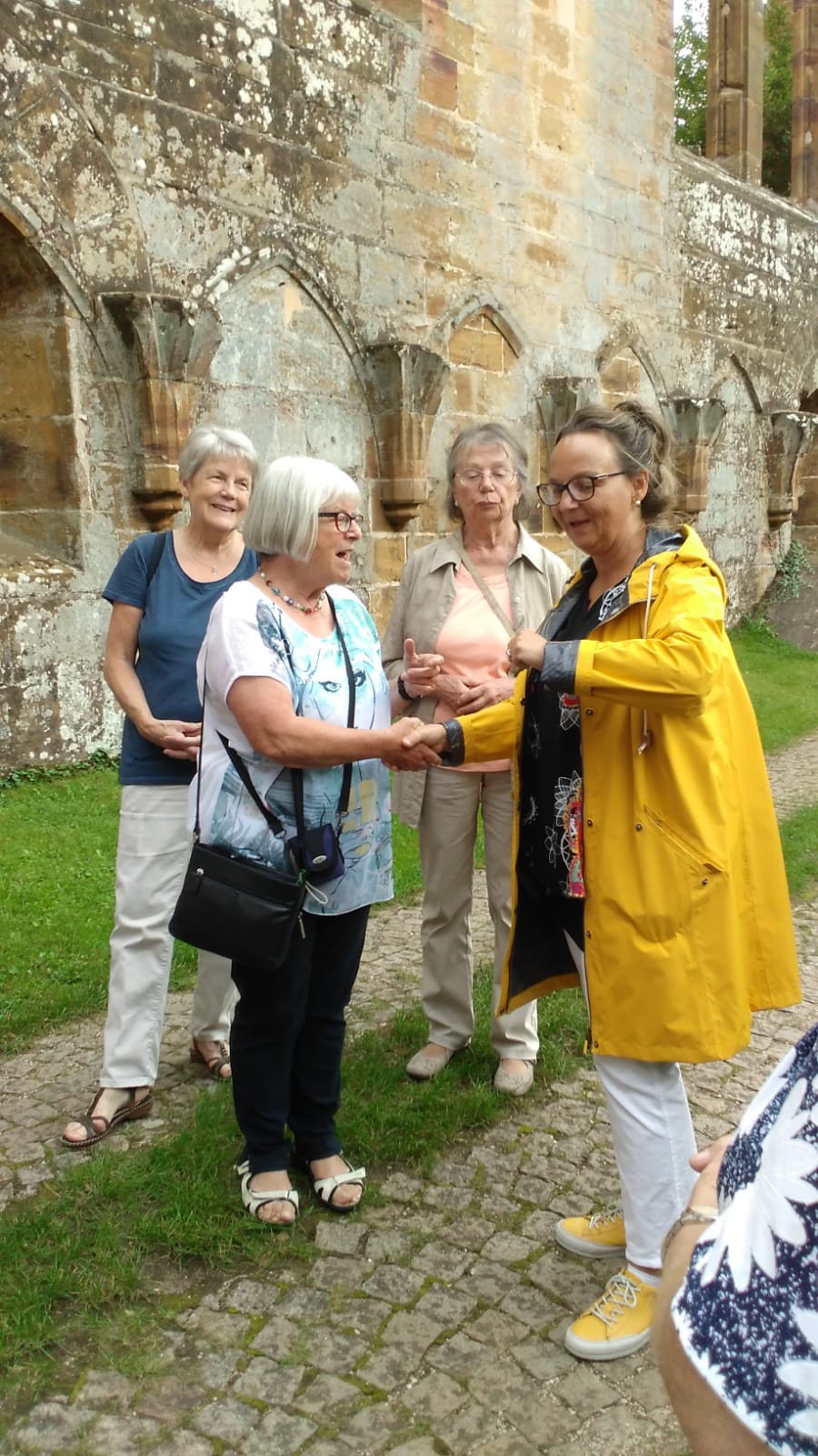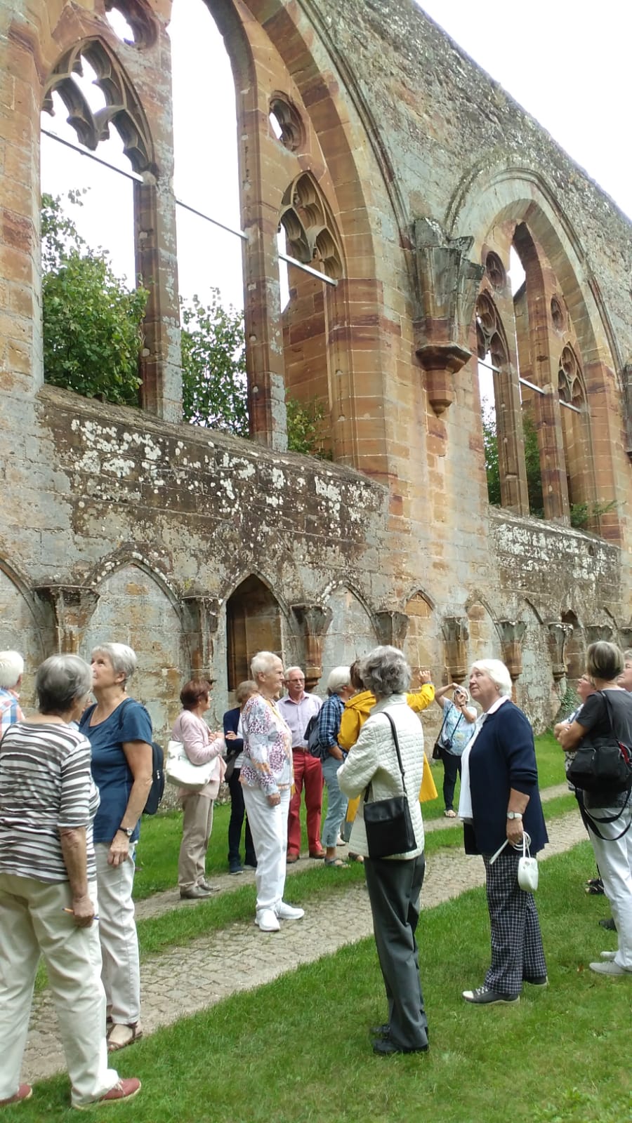 Der Ev. Frauenbund Altdorf hatte zu seinem Septembertreffen nach Gnadenberg in der nahe gelegenen Oberpfalz eingeladen. 26 Frauen und einige Männer waren dieser Einladung gefolgt. Frau Dr. Sandra Frauenknecht, die die Sanierung und Restaurierung des „Klosterstadels“ betreut und darüber promoviert hat, übernahm die Führung durch Kloster und Kirchenruine. Mit spannenden und begeisternden Berichten informierte sie über die Geschichte des Klosters und seine Sanierung seit 2013. Kloster Gnadenberg wurde nach 1422 durch Katharina von Pommern-Stolp , der Gattin des Pfalzgrafen Johann von Neumarkt-Neunburg gegründet und zwar nach den Regeln des Birgittenordens. Klostergründungen waren damals ein Versuch, angesichts der katastrophalen Situation der Kirche zu größerer Frömmigkeit aufzurufen. Die junge Katharina von Pommern kannte das erste Kloster des Birgittenordens in Vadstena/Schweden. Nach den Plänen der Hl. Birgitta von Schweden entstand in Gnadenberg ein Doppelkloster für 60 Nonnen und 25 Brüder bzw. Priester. Das Kloster wurde von einer Äbtissin geleitet, die Priester und Brüder sollten sie beraten und die Pilger betreuen, die die Kirche besuchten.Es galten strenge Klausurregeln, d.h. der Tag begann um 5 Uhr mit einer Messe. Vom Schlafsaal aus konnten die Nonnen auf eine Kirchenempore gehen und der Messe beiwohnen. Jeden Freitag fand eine Karfreitagsprozession statt, bei der die Nonnen durch den Kreuzgang schritten und die sieben Bußpsalmen rezitierten. Allen Besuchern wurde der Durchgang vom Dormitorium zur Kirche gezeigt. In dem renovierten Schlafsaal sind heute die Namen aller Nonnen und Brüder aufgeführt, die in Gnadenberg gelebt haben ehe das Kloster 1563 – nach der Reformation – aufgelöst wurde. Großformatige Fotografien aus dem noch bestehenden Kloster in Vadstena veranschaulichen das Klosterleben.In den über 100 Jahren seines Bestehens erhielt das Kloster viele Spenden und Stiftungen, u.a. aus der reichen Stadt Nürnberg.Zum Schluss konnten alle einen Blick in den Klostergarten werfen, der anstelle des ehemaligen Kreuzgangs angelegt wurde. Auf dem Weg in die imposante Kirchenruine zeigte Dr. Frauenknecht die beiden Haupttore, die „Pforte der Sünde“, durch die die Pilger eintraten und die „Pforte der Verzeihung“ , durch die sie sie wieder verließen. Vom 15. April bis 15. Oktober kann das Konventsgebäude mit vielen Informationen samstags und sonntags von 14 bis 17 Uhr besucht werden. C.Seichter