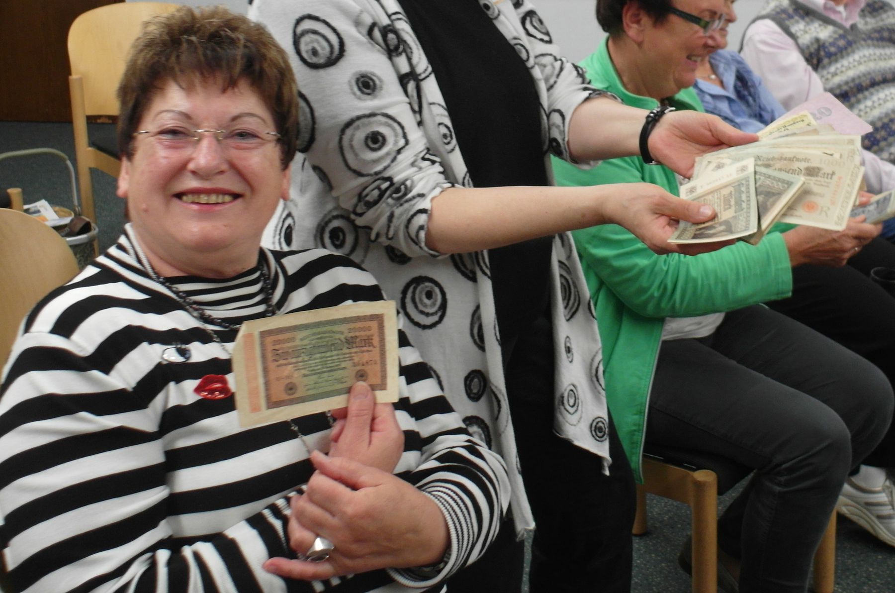 Am Abend konnten sich die Teilnehmerinnen, didaktisch unterstützt, ihre Erlebnisse mit Geld untereinander mitteilen. Eine Teilnehmerin verteilte überraschend „Millionen“, nämlich Inflationsgeld aus den 1920er Jahren.