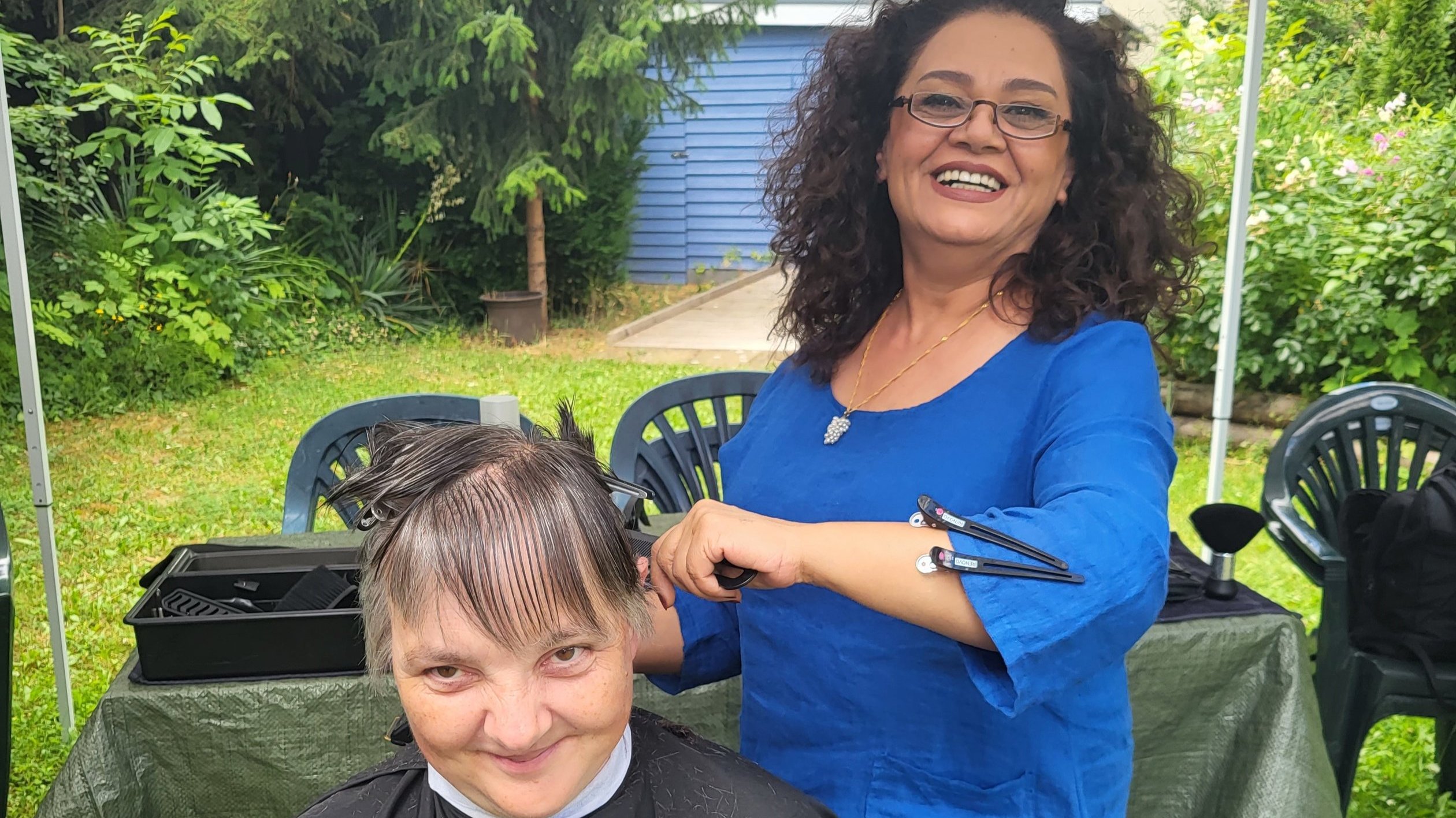Aufgrund glücklicher Umstände hatte sich die Frisörmeisterin von Amedy´s-Haarstudio mit ihrem Mitarbeiter für diese Aktion zur Verfügung gestellt. Ihre vielen Utensilien breitete sie auf einem Tisch aus - sogar ein Spiegel war im Gepäck dabei!