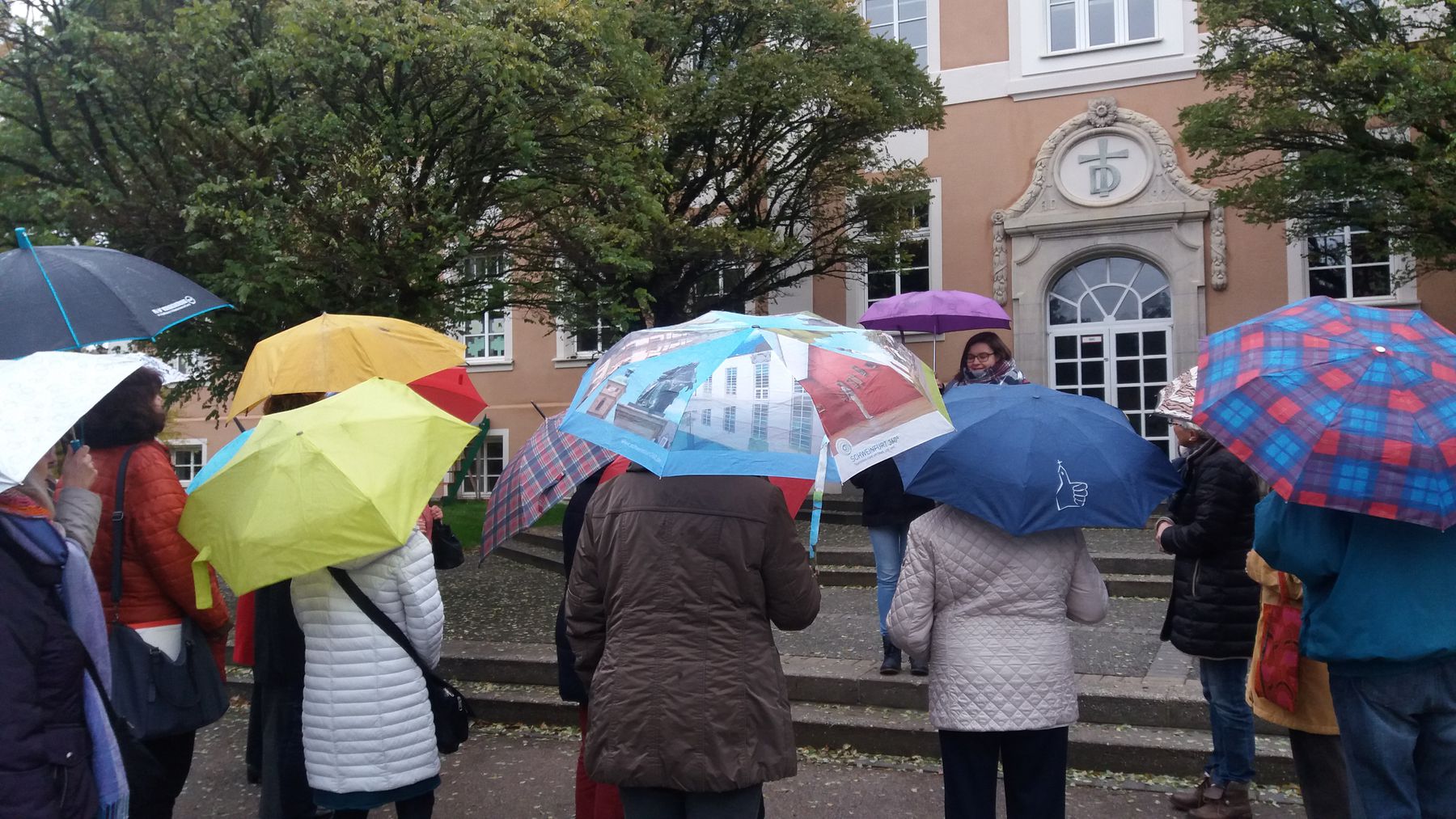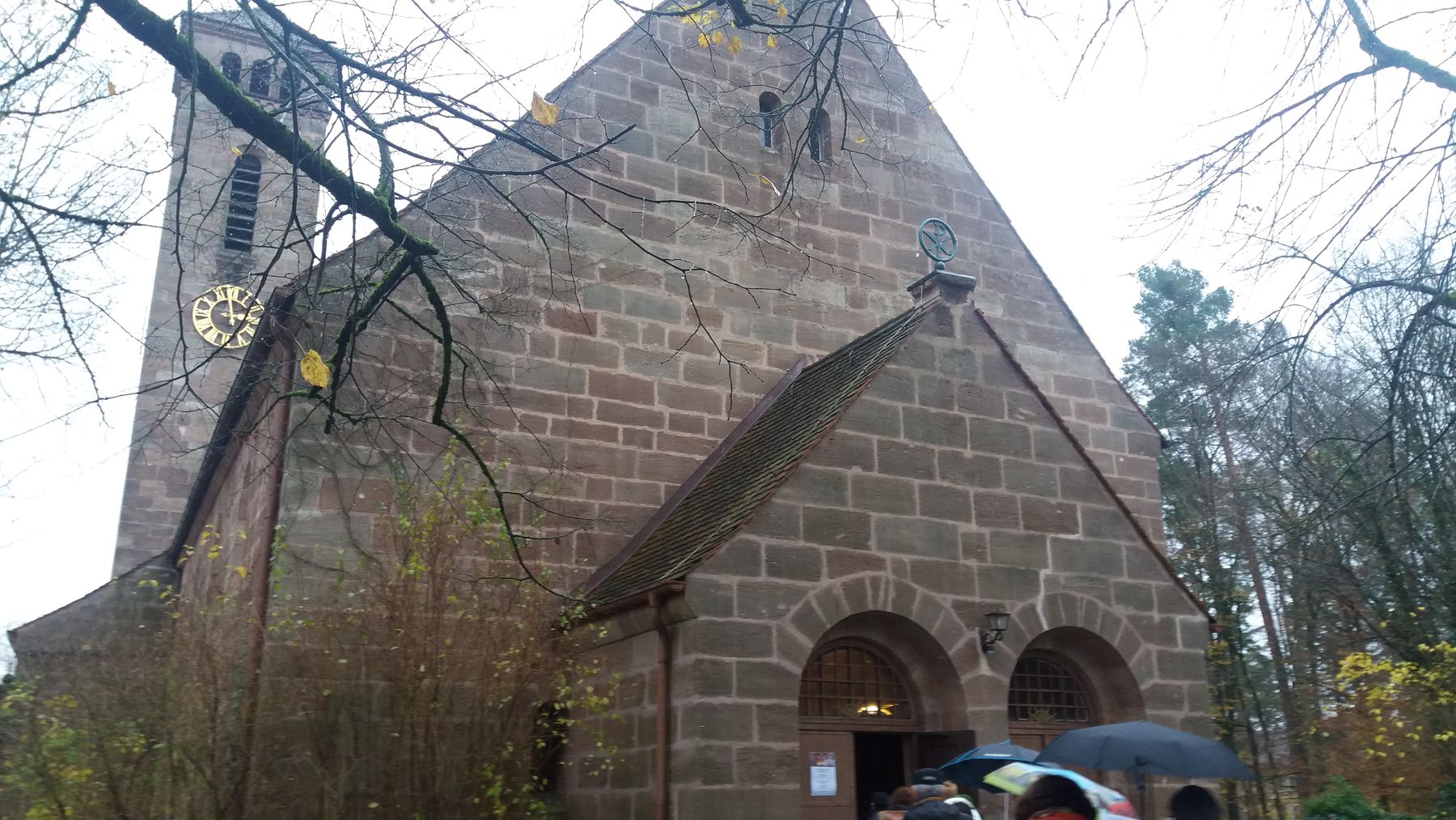 Bei einem wegen des Regenwetters verkürzten Rundgang über das Gelände wurde die Führung im Wechsel von Martina Fritze und den beiden jungen Frauen fortgesetzt. Der Bibelgarten wurde bei triefender Nässe nur gestreift. Unter bunten Regenschirmen erfuhren die Teilnehmerinnen von der Tätigkeit und gründlichen Ausbildung der Diakone vor deren großem Diakonenhaus und der Diakoninnen, die im nahen ehemaligen Pfarrhaus untergebracht sind. Danach besichtigten die Teilnehmerinnen die Philippuskirche, die von den Diakonen und den von ihnen betreuten Jugendlichen 1927 überwiegend selbst errichtet wurde. An der Decke wurde für jeden beteiligten Diakon ein Stern angebracht. Erst unsere Zeit fügte der Gerechtigkeit halber auch für die Jugendlichen ohne Diakonsrang einen Stern hinzu. Die Wandmalerei im Altarbereich zeigt die Sieben Werke der Barmherzigkeit, verkörpert von je einem Diakon: Durstigen zu Trinken geben, Gefangene besuchen, Tote bestatten, Kranke pflegen und heilen, Fremde aufnehmen, Hungrigen Essen und Nackten Kleidung geben. Beim Dienst am lebenden Menschen werde die Aufgabe der Bestattung Gestorbener oft schon nicht mehr mitgedacht, erklärte Martina Fritze und führte nachfolgend über den Friedhof. Die Rummelsberger Diakonie stellt auch einen Friedwald für Bestattungen zur Verfügung. Novembergedanken, die sich aber beim abschließenden gemeinsamen Kaffeetrinken im Café auflösten in angeregten Gesprächen.