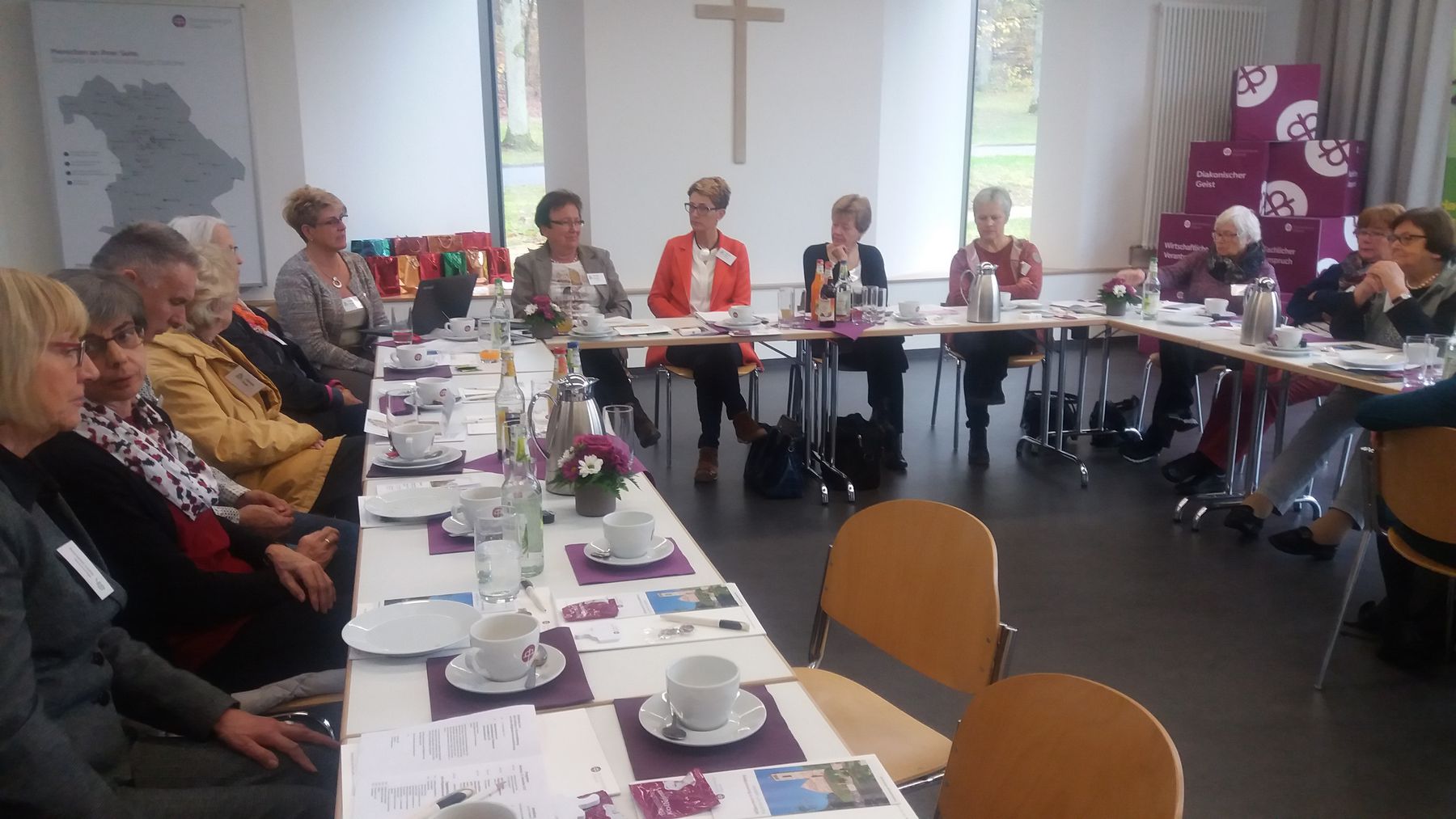 Nach der Mittagspause hielt die Rummelsberger Diakonin Martina Fritze zusammen mit zwei Auszubildenden (zur Diakonin) einen Vortrag über die Organisation der Rummelsberger Diakonie und ihrer Geschichte, wie die lange nur männlichen Diakone mit ihren Schützlingen den Weg aus der Stadt Nürnberg heraus ins Umland machten, wo die Gemeinschaft 1904 den Berg und das Gut Rummelsberg erworben hatte.