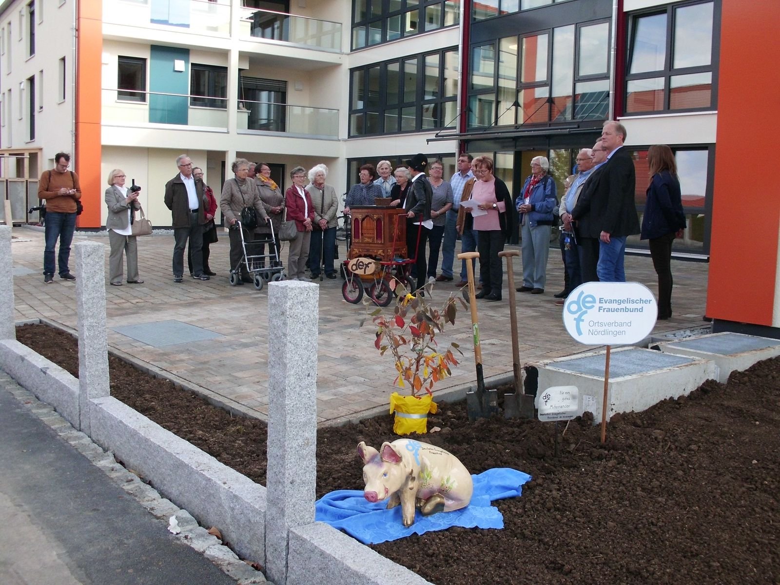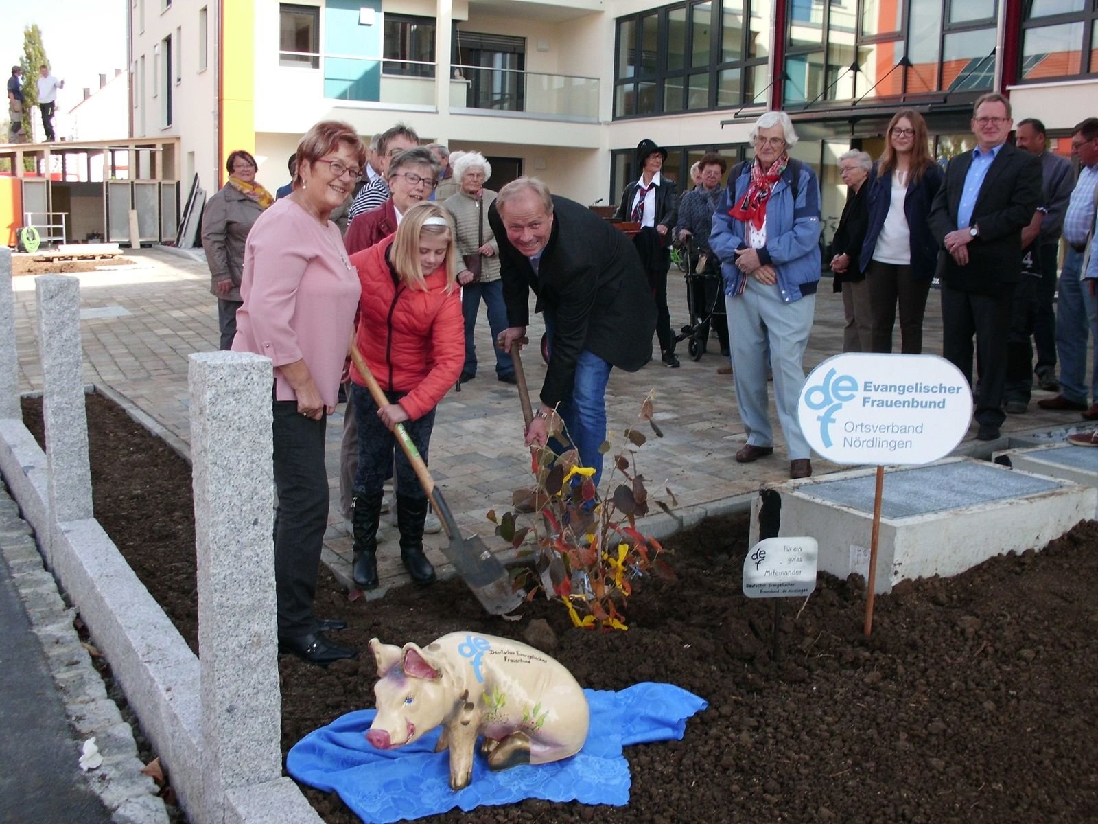 Der Deutsche Evangelische Frauenbund OV Nördlingen pflanzte als Zeichen des Miteinanders von Jung und Alt einen Strauch, eine Zaubernuss, die im Frühjahr als allererstes Gehölz kleine gelbe Blüten treibt. Die Pflanze steht nun in der Außenanlage des Mehrgenerationenhauses der Gemeinnützigen Baugenossenschaft Nördlingen eG am Saubrunnen. Bei Drehorgelmusik und strahlendem Sonnenschein konnte im Beisein der Mitglieder des DEF, Blasius Wizinger, dem Geschäftsführer der Baugenossenschaft, Architekt Erich Lokietsch und dem 2.Bürgermeister Markus Landenberger-Schneider, die Staude mit Freunden und Interessierten in die Erde gesetzt werden.
