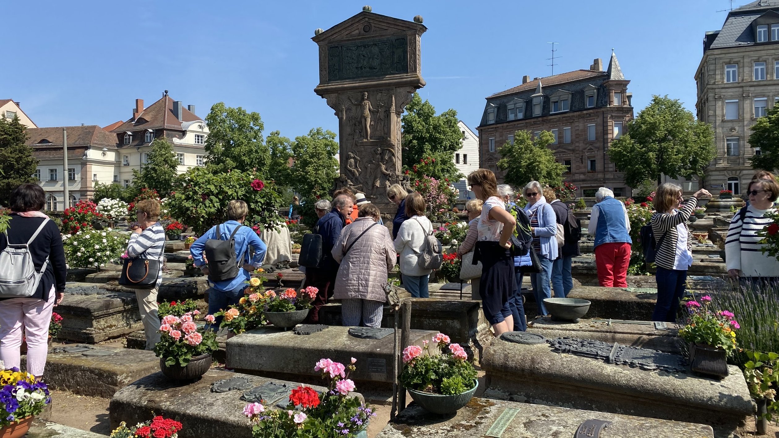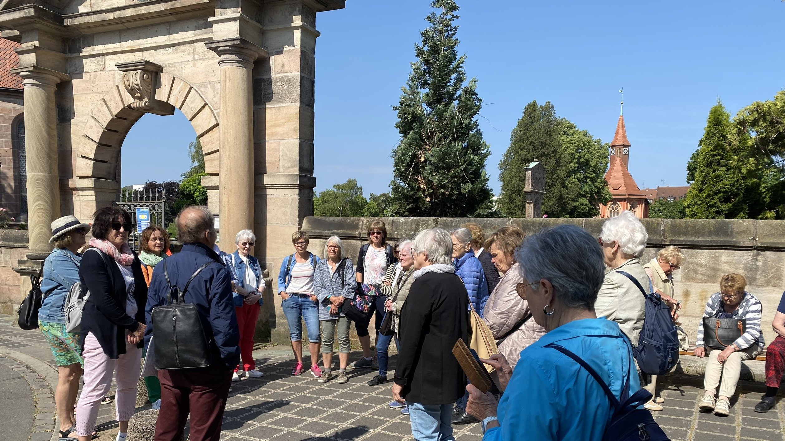 Unsere diesjährige Stadtfahrt führte uns am 16.6.2023 nach Nürnberg. 25 Teilnehmerinnen fuhren am frühen Morgen von Marktbreit mit dem Zug nach Nürnberg. Zuerst besuchten wir den Johannisfriedhof mit über 6000 Gräbern. Ein Gästeführer von den Altstadtfreunden Nürnberg brachte uns die Geschichte des berühmten Friedhofes näher und erklärte uns die wertvollen Bronzeepitaphien. Außerdem zeigte er uns die Gräber berühmter Nürnberger Bürger, wie z. B. die Gräber von Albrecht Dürrer und Hans Sachs. Bewusst haben wir als Termin Anfang Juni gewählt, da zu dieser Jahreszeit, die Rosen in voller Blüte sehen und jedes Grab von einem Rosenstock geziert wird. Eine Augenweide nicht nur für Blumenliebhaber. Nach dem gemeinsamen Mittagessen hatten wir genügend Zeit, um die Stadt auf eigene Faust zu erkunden bzw. für einen Stadtbummel oder um eine Tasse Kaffee in den zahlreichen Cafés zu genießen. Bei der anschließenden, kurzweiligen und bequemen Fahrt mit der Bimmelbahn durch die Altstadt konnten wir noch viele Sehenswürdigkeiten bestaunen und erfuhren nebenbei noch Wissenswertes und Witziges über Nürnberg, bevor wir gegen 18 h die Heimreise antraten. Das allgemeine Feedback der Teilnehmerinnen: ein wunderschöner, gelungener Tagesausflug.