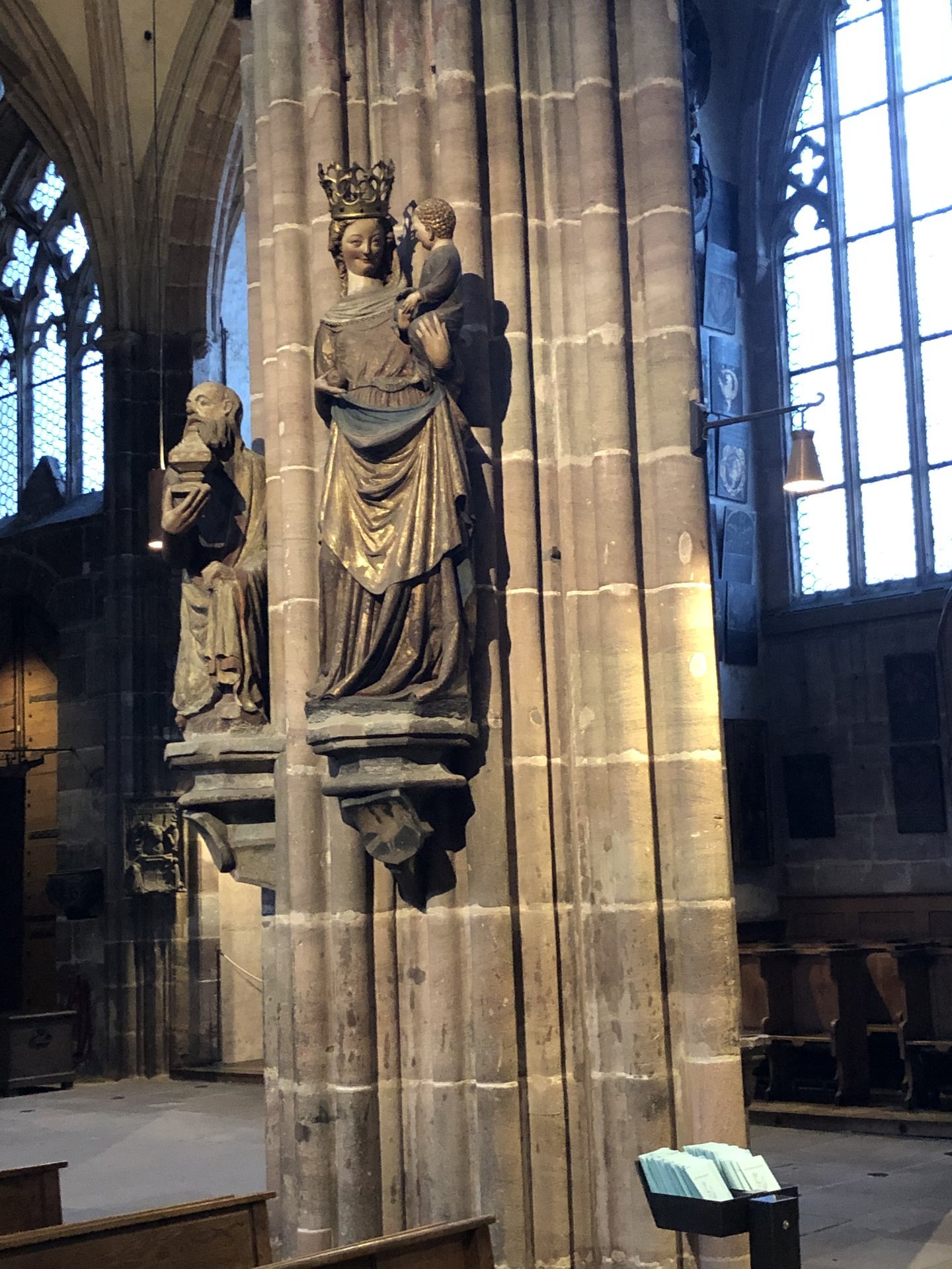 Das älteste Kunstwerk der Kirche hängt an einem Pfeiler des Mittelschiffs und zeigt die SCHÖNE MADONNA von ca. 1280. Sie hat bereits den Vorgängerbau geziert. Besonders anrührend ist das zarte Lächeln Marias über das vergnügte Jesuskind auf ihrem Arm, das sich spielerisch an den großen Zeh fasst.