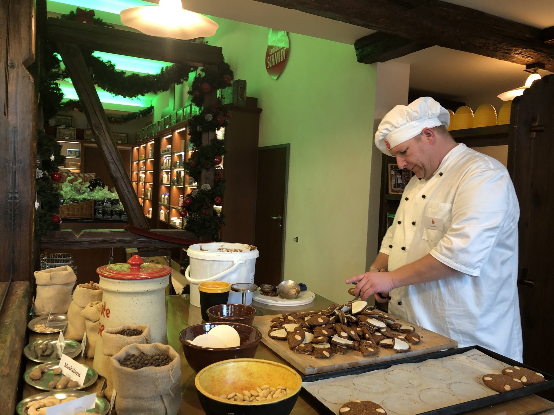 Der zweite Besuchspunkt am Nachmittag lag bei Lebkuchen SCHMIDT. Hier konnte die Gruppe bei einer Tasse Kaffee oder Glühwein nebst einem Lebkuchen die Produktion von Lebkuchen im Werk in allen Variationen sowie von anderen süßen Spezialitäten in einem lebendig gestalteten Film verfolgen. Dabei saßen die Besucher an langen Tischen in einem weihnachtlich dekorierten Raum. Die Firma Lebkuchen SCHMIDT fusionierte schon vor Jahren mit der Firma WICKLEIN, die ebenfalls Lebkuchen produziert. Der tägliche Ausstoß an Lebkuchen ist in der vorweihnachtlichen Zeit am größten und wird von 600 Mitarbeitern mit einer unvorstellbar großen Menge an Zutaten von Mehl, Nüssen, Mandeln und Gewürzen geleistet. In der großen Sortimentsauswahl im angrenzenden Shop herrschte rege Nachfrage.