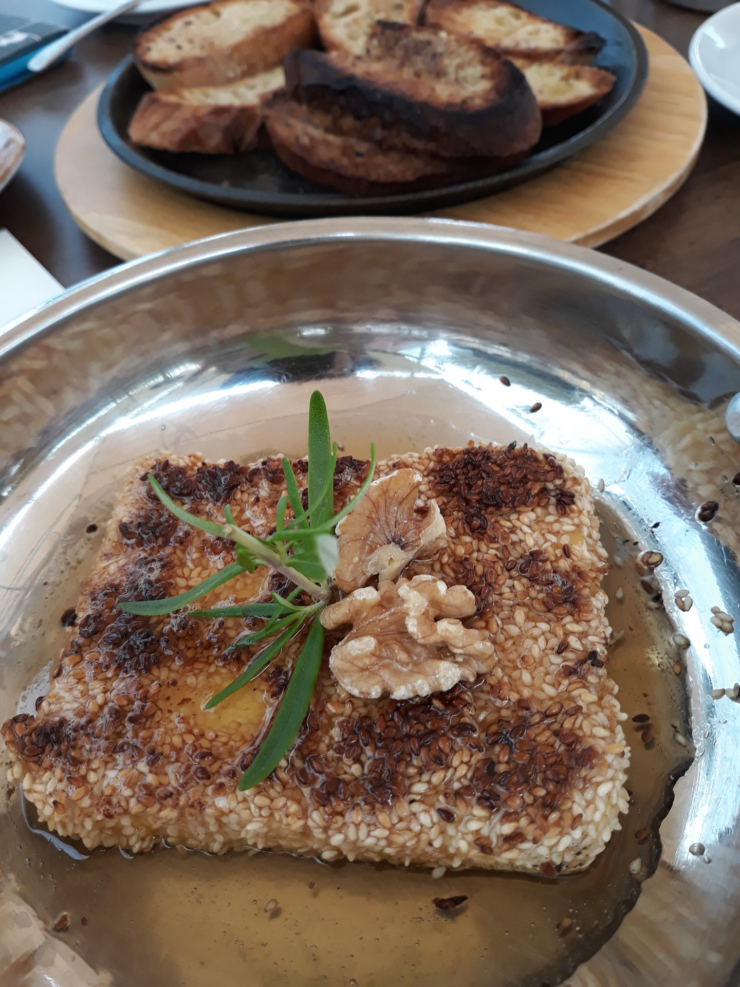 1 Scheibe Fetakäse abtrocknen, 1 Ei in einem Teller verquirlen und Sesam in einen Teller geben. Feta erst im Ei, dann im Sesam rundherum wälzen und fest andrücken. In einer Pfanne Olivenöl erhitzen und den Feta von allen Seiten gut anbraten, aber Vorsicht! Der Sesam verbrennt recht schnell. Aus der Pfanne nehmen und auf Küchenkrepp kurz abtropfen lassen. In einen Teller legen und mit gutem Honig übergießen, mit Walnüssen bestreuen. Dazu passt Knoblauchbrot und ein frischer Salat.