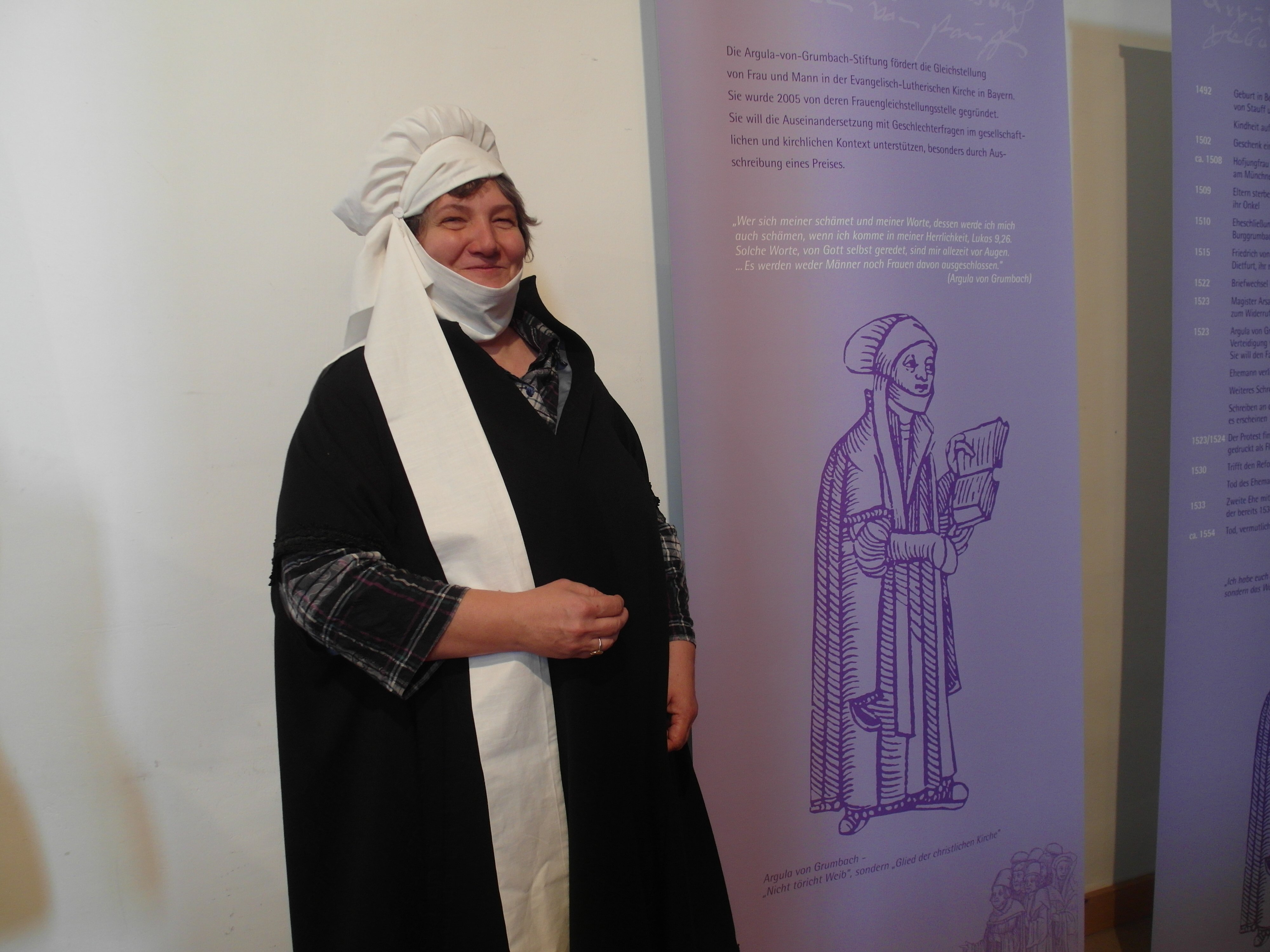 Die Frauen konnten sogar in einen eigens für die Ausstellung geschneiderten Mantel und somit ein wenig in die Haut einer reformatorischen Frau schlüpfen. Nach dem in den Flugblättern überlieferten Aussehen der Argula von Grumbach hatte nämlich Pfisterer-Haas einen Mantel und eine Haube mit Gebende schneidern lassen. Es ist ein Erlebnis, mit dem Mantel sozusagen in die Zeit und in die Rolle der streitbaren und hochgebildeten Argula von Stauff verheiratete von Grumbach schlüpfen zu können.