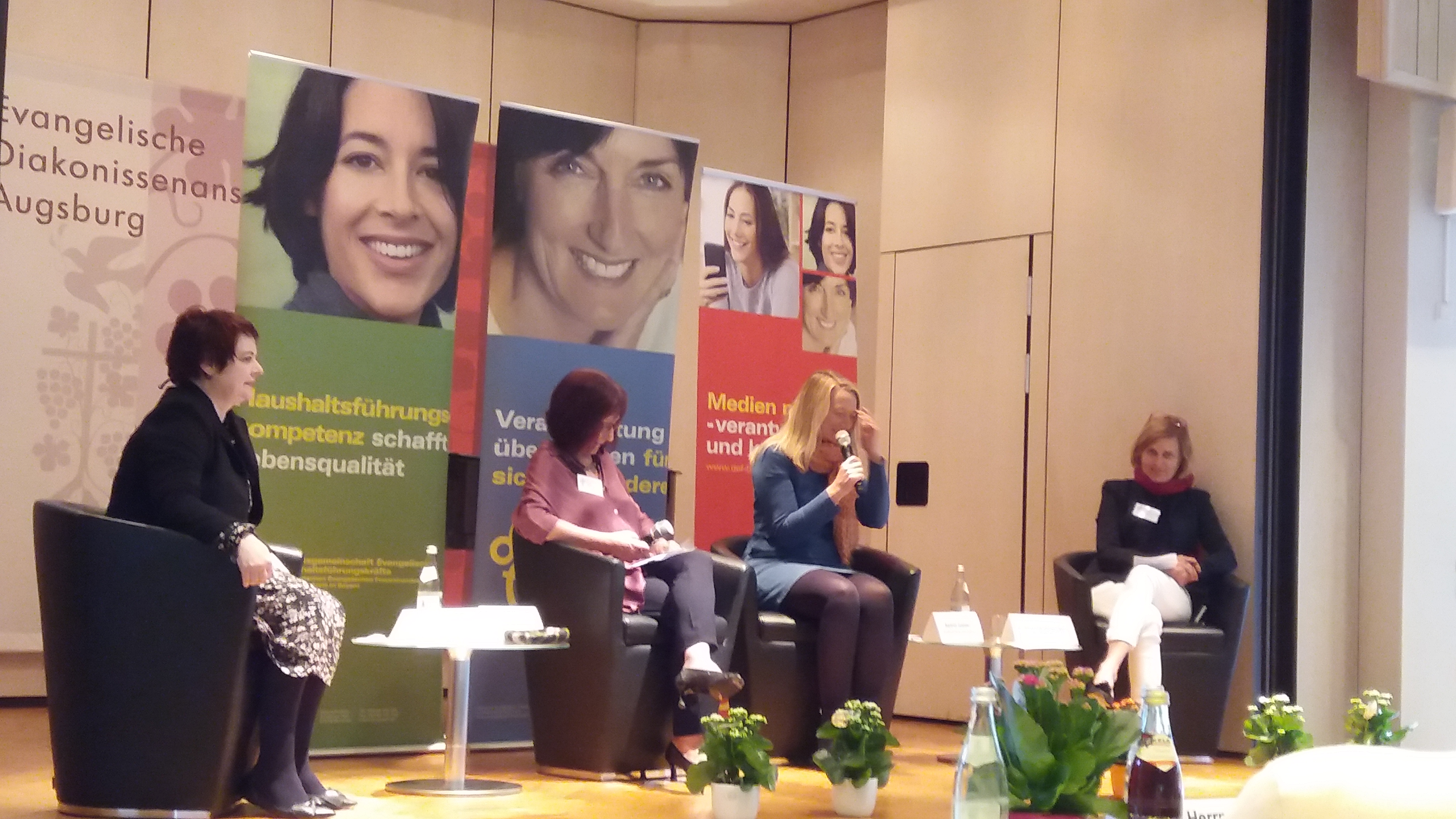 Dem in der Gesellschaft gerade jetzt nötigen Dialog und der Förderung der Demokratie war auch der Studientag in Augsburg gewidmet. „Frauen gestalten Demokratie“ war das Motto einer Podiumsdiskussion im Saal des Diako-Hotels in Augsburg. Den weitesten Weg hatte DEF-Mitglied und Landessynodalin Verena Osgyan, MdL (Grüne) aus Nürnberg. Die anderen beiden Diskutantinnen stammen aus Augsburg, Astrid Gabler, die Vorsitzende der Frauen-Union der Stadt (CSU), sowie aus Stadtbergen: Dr. Simone Strohmayr, MdL (SPD). Im Publikum nahm außerdem Melanie Hippke, Bezirksvorsitzende Schwaben der Grünen Frauen, an dem Studientag teil. Die Diskussion wurde geleitet von Dr. Johanna Beyer, München. Sie setzte sich gleich zu Anfang kritisch mit der Verbandsgeschichte des DEF auseinander, der die Forderung nach dem Frauenwahlrecht nicht unterstützte und zwei Wochen, bevor der Bund Deutscher Frauenvereine den Beschluss pro Frauenwahlrecht fasste, diesen Dachverband verließ. Als es dann aber nach dem Ersten Weltkrieg so weit war und Deutschland eine Republik, eilte sich der Verband, die Frauen über ihr Wahlrecht aufzuklären und sie zu bilden, stellte nachgehend auch einige MdR, und sei seither „in inniger Vertrautheit“ mit Frauen in der Politik. Andrea Nahles, leitete Beyer das Gespräch ein, habe in der Abizeitung geschrieben, sie wolle „Hausfrau oder Bundeskanzlerin“ werden. Was hätten denn die Podiumsfrauen zu ihrer Abizeit für Vorstellungen gehabt? Alle hatten von Jugend an politisches Interesse. Verena Osgyan sagte, als sie Journalistin geworden sei, habe sie sich nicht vorstellen können, später einmal selbst Berufspolitikerin und Landtagsabgeordnete zu sein. Astrid Gabler wollte in die Entwicklungshilfe gehen und wurde dann Dokumentarfilmerin. Die Arbeit als Fernsehjournalistin ließ sich wegen der in Bayern schlechten Kitasituation nicht mit der Familie vereinbaren, also verließ sie ihren Job und stand wegen der drei Kinder zurück. Kanzler Gerhard Schröders Gerede vom „Gedöns“ aber politisierte sie, ließ sie tätig werden. Sie wuchs über den vorparlamentarischen Raum in die politische Arbeit hinein, arbeitete für ein Mitglied des Europäischen Parlaments und kandidierte vor sechs Jahren auf Platz 32 der CSU-Liste für den Augsburger Stadtrat. Inzwischen ist es der Platz 4. Verena Osgyan schilderte ein ähnliches Aha-Erlebnis in den Medien, als sie eine „Elefantenrunde“ im Fernsehen sah mit Jutta Ditfurth als einzige Frau unter lauter Männern. Tschernobyl und das Eingesperrtsein in den Tagen danach war auch ein Schlüsselerlebnis, warum sie sich später in der Antiatombewegung engagierte. Als Merkel den Atomausstieg rückgängig machte, wurde Osgyan von der „Karteileiche“ zur Aktivistin und übernahm bald als Grünen-Kreisvorsitzende Verantwortung. Daraus ergab sich die Landtagskandidatur und Osgyan wurde gewählt. Im Bayerischen Landtag säßen gegenwärtig nur ein Viertel Frauen! Sie findet Frauenthemen sehr spannend. Jetzt kandidiert sie als Oberbürgermeisterin für Nürnberg. Ihre Devise lautet „Springen und schauen, wie weit man kommt!“