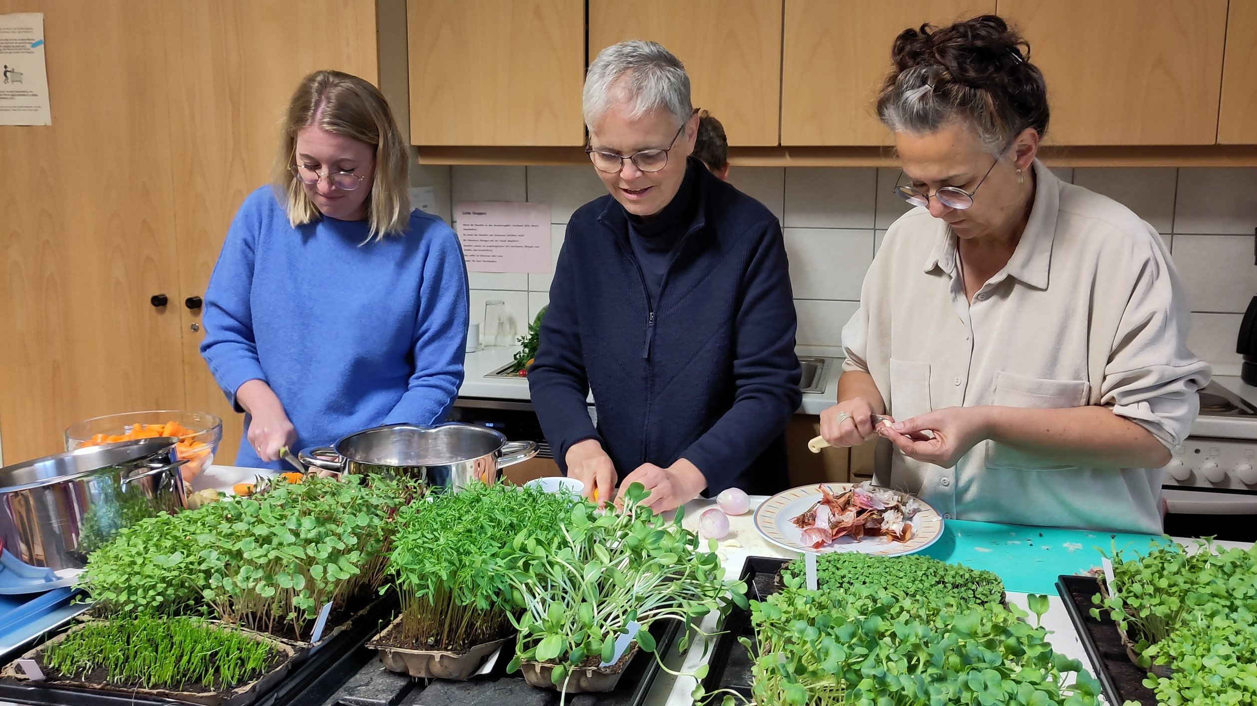 Nach etwa einer Stunde trafen sich alle im evangelischen Gemeindehaus, wo gemeinsam eine marokkanische Möhrensuppe mit zuvor frisch geernteten Karotten zubereitet wurde. Ebenso wurden Butterbrote mit verschiedensten Keimlingen belegt, von denen die meisten Frauen gar nicht wussten, dass es davon eine so große Vielfalt gibt, die man verspeisen kann. Das gemeinsame Essen bei guten Gesprächen rundeten den interessanten, sehr gelungenen Nachmittag ab.