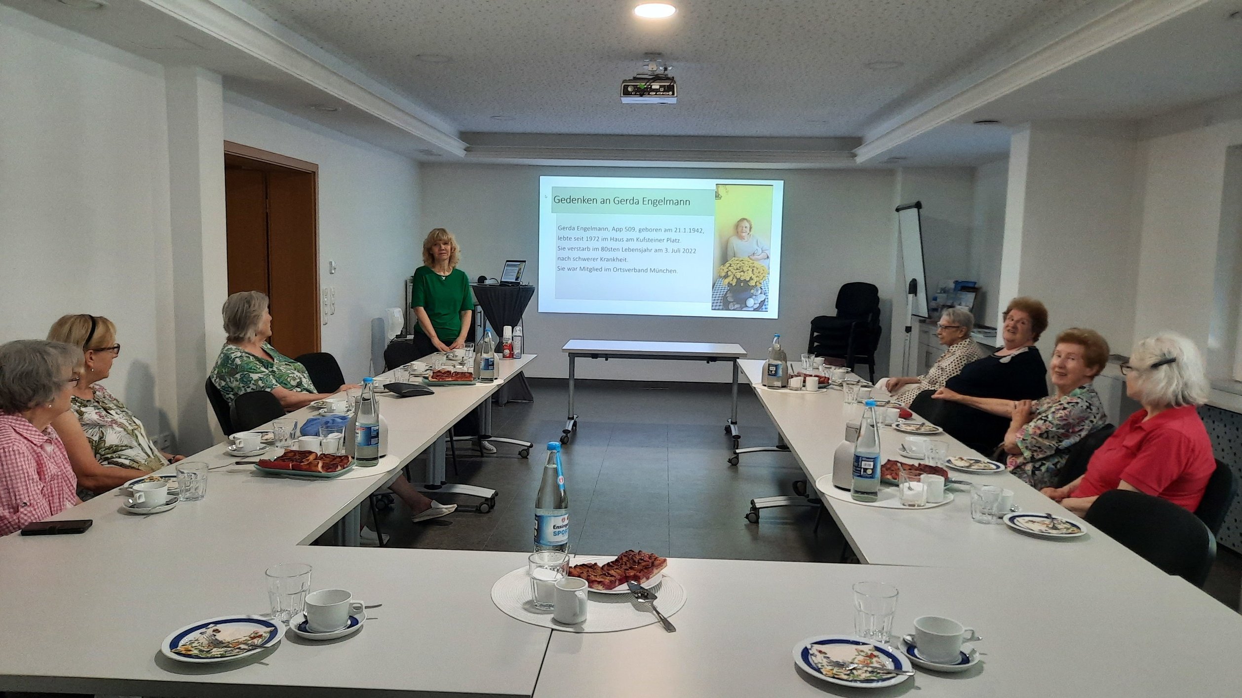 Am Donnerstag, den 28.7. trafen sich einige Mieterinnen und Ortsverbandsfrauen des DEF im Saal des Hauses am Kufsteiner Platz, um an Christa Zitzschmann (gest. mit 97 Jahren) und Gerda Engelmann (gestorben am 3. Juli im 80sten Lebensjahr) zu gedenken. Beide waren langjährige Mieterinnen des Hauses.