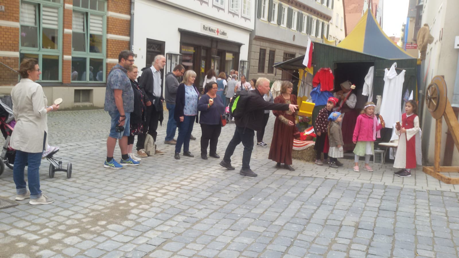 Am Stand des DEF, wie ein Zelt auf einem mittelalterlichen Jahrmarkt in den Farben einer freien Reichsstadt Schwarz und Gold aufgemacht, herrschte reges Treiben von Alt und Jung. Es bildeten sich sogar Schlangen. Holzspielzeuge sorgten für Kurzweil beim Publikum. Es drehte sich ein hölzernes Glücksrad. Und beim eigens hergestellten historischen Wurfspiel waren ein gutes Auge und Geschicklichkeit gefragt. Den Gewinnern winkte als Preis ein jeweils gern genommener prächtiger Apfel. Das Wichtigste aber waren das Vergnügen und die Gemeinschaft. Sicher hat der gute Auftritt dem Frauenbund Nördlingen wieder neue Freundinnen und Freunde gewonnen.