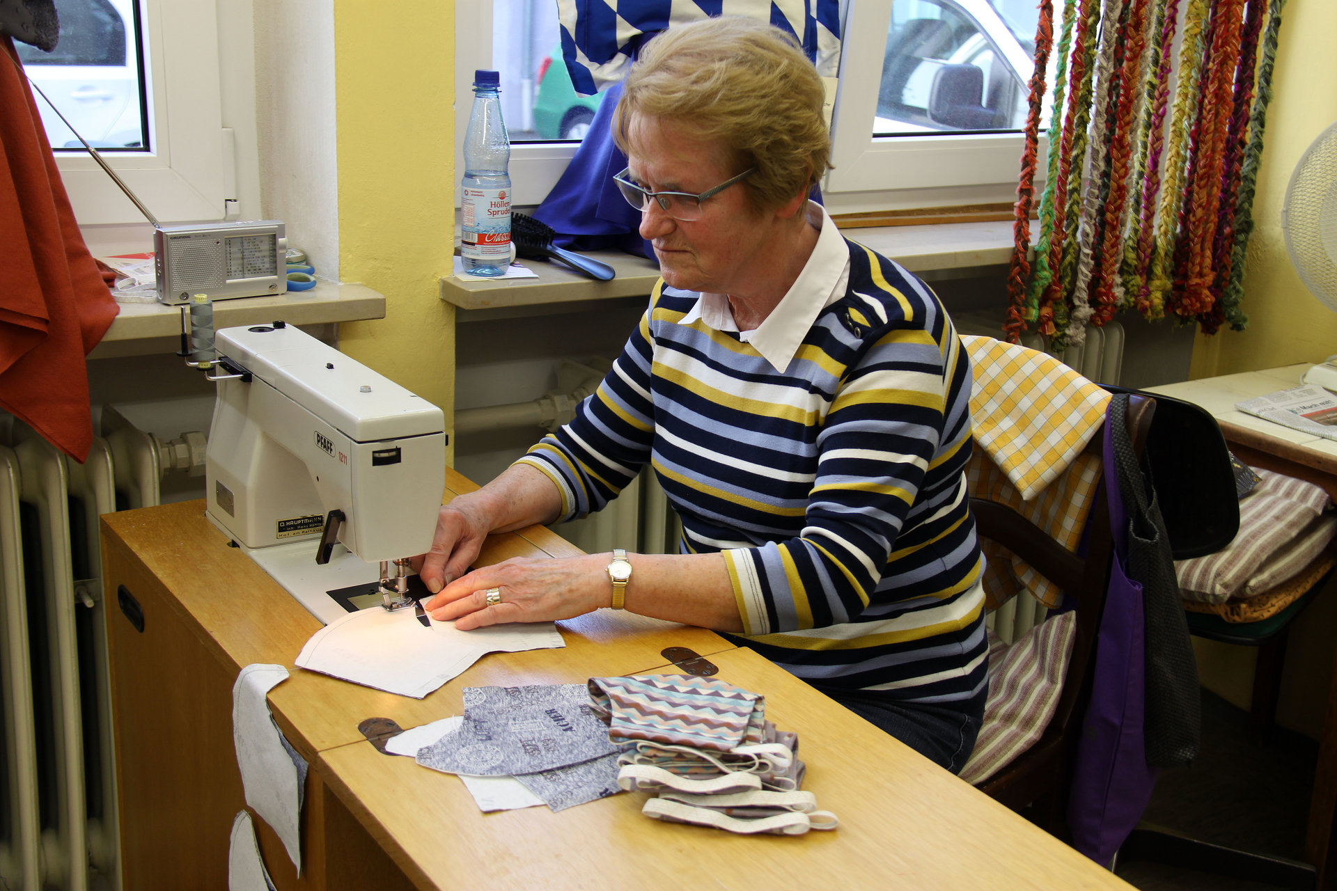 Angesichts der Corona-Pandemie fertigt die Evangelische Frauenhilfe Hof in ihren Räumen sowie in Heimarbeit einen Mund- und Nasenschutz. Die Behelfsmasken aus zwei Lagen Stoff und einem dazwischen liegenden Vlies sind wiederverwendbar. Nach jeder Benutzung können sie bei 60 Grad gewaschen werden. Als Schutz für Mitarbeitende der Diakonie Hochfranken, das Team einer Arztpraxis sowie in der Seniorenbegleitung einer Kirchengemeinde sind die Masken bereits im Einsatz.