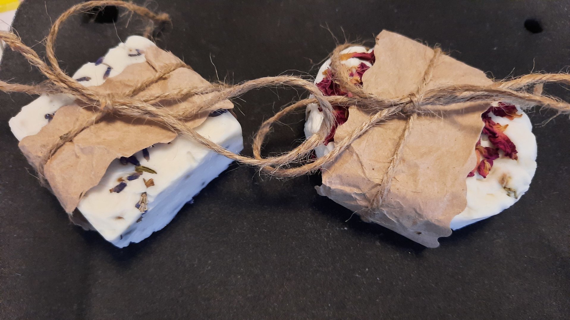 Auf einer Ansteckplatte erwärmte Sigrid Fernando einen Topf grob geraspelte Kernseife und rührte sie mit etwas Wasser und hochwertigem Olivenöl, sowie entsprechenden natürlichen Duftölen zu einer Masse. Diese wurde dann mit einem Schaber in die vorbereiteten Förmchen gestrichen. Die Innenseite der Förmchen war bereits mit Rosenblättern oder Lavendelblüten garniert. Diese kommen dann auf der fertigen Seife ganz oben zu liegen. Man kann die Blätter sowie Duftöle auch der Seifenmasse untermengen, dass sie nicht nur auf, sondern im Seifenstück selbst zu finden sind. Auch auf die Seifenrückseite, die glattgestrichen oben in der Form liegt, kann man, wenn es nicht mehr zu heiß ist, noch einige Blätter eindrücken. Bei noch warmen, aber nicht mehr heißen Seifenstücken konnten die Teilnehmerinnen das Formen und Rollen auch von Hand übernehmen, ein batziges, aber das Begreifen vertiefendes Erlebnis. Umso mehr konnte frau das Gefühl haben: Ich habe eine Seife gemacht! Das Ergebnis kann sich sehen lassen.