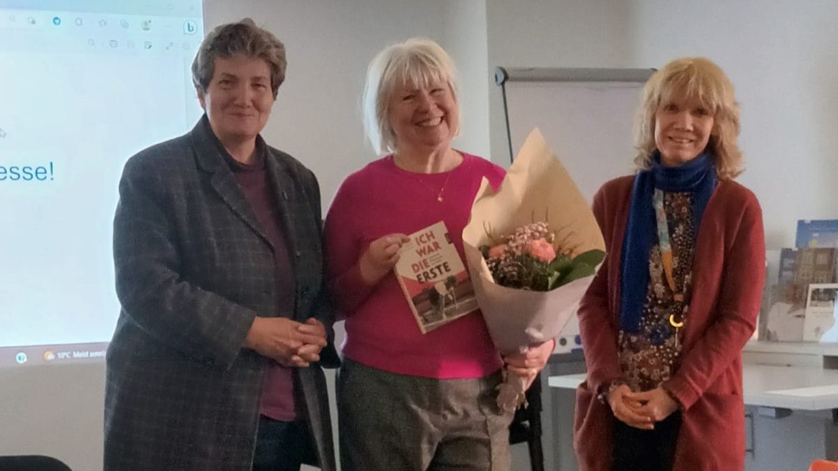 Bild: Bettina Marquis, Vorsitzende des DEF-Ortsverbands München (li.) und ihre Stellvertreterin Maren Puls (re.) bedanken sich bei der Autorin Adelheid Schmidt-Thomé