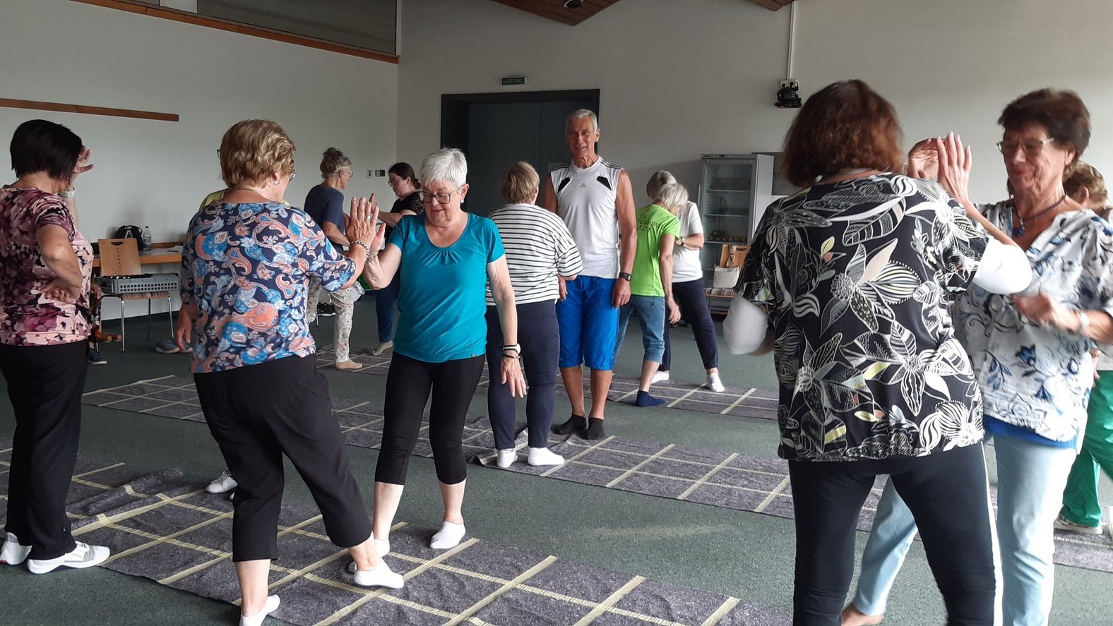 Der Großteil der Teilnehmerinnen und Teilnehmer nahmen an den durchaus schweißtreibenden Bewegungseinheiten teil. Es war eben auch in Ordnung, wenn Teilnehmende auf dem Stuhl „sich bewegten“. Eine Teilnehmerin meinte: „So fit bin ich nicht mehr, aber im Kopf kann ich die Bewegungen trotzdem mitmachen. Das tut mir gut.“