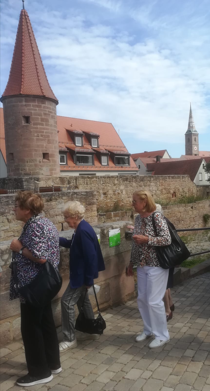 Die Minnestadt Wolframs-Eschenbach war das erste Reiseziel der Bildungsfahrt des DEF Ansbach nach der langen Coronapause. Und am Denkmal des Minnesängers begann die interessante Stadtführung (90 Min.). Vor der Marienkirche grüßt Walburgis, eine Statue des Künstlers Steinacker. In der Kirche wie auch sonst in der Kleinstadt wird der Einfluss des Deutschordens sichtbar. Selbst vom Kirchturm mit den bunten Ziegeln, leuchtet das Wappen des Ordens. Imponierend die beiden Altäre: Kreuzauffindungsaltar und der Rosenkranzaltar. An der „alten Schule“ hörten wir von den besonderen Erziehungsmethoden unserer Vorfahren: Messebesuch vor Schulbeginn, im Sommer wegen Erntehilfe kein Unterricht und im Winter der anstrengende Marsch durch den tiefen Schnee…Wie human sind doch die heutigen Erziehungsmethoden!