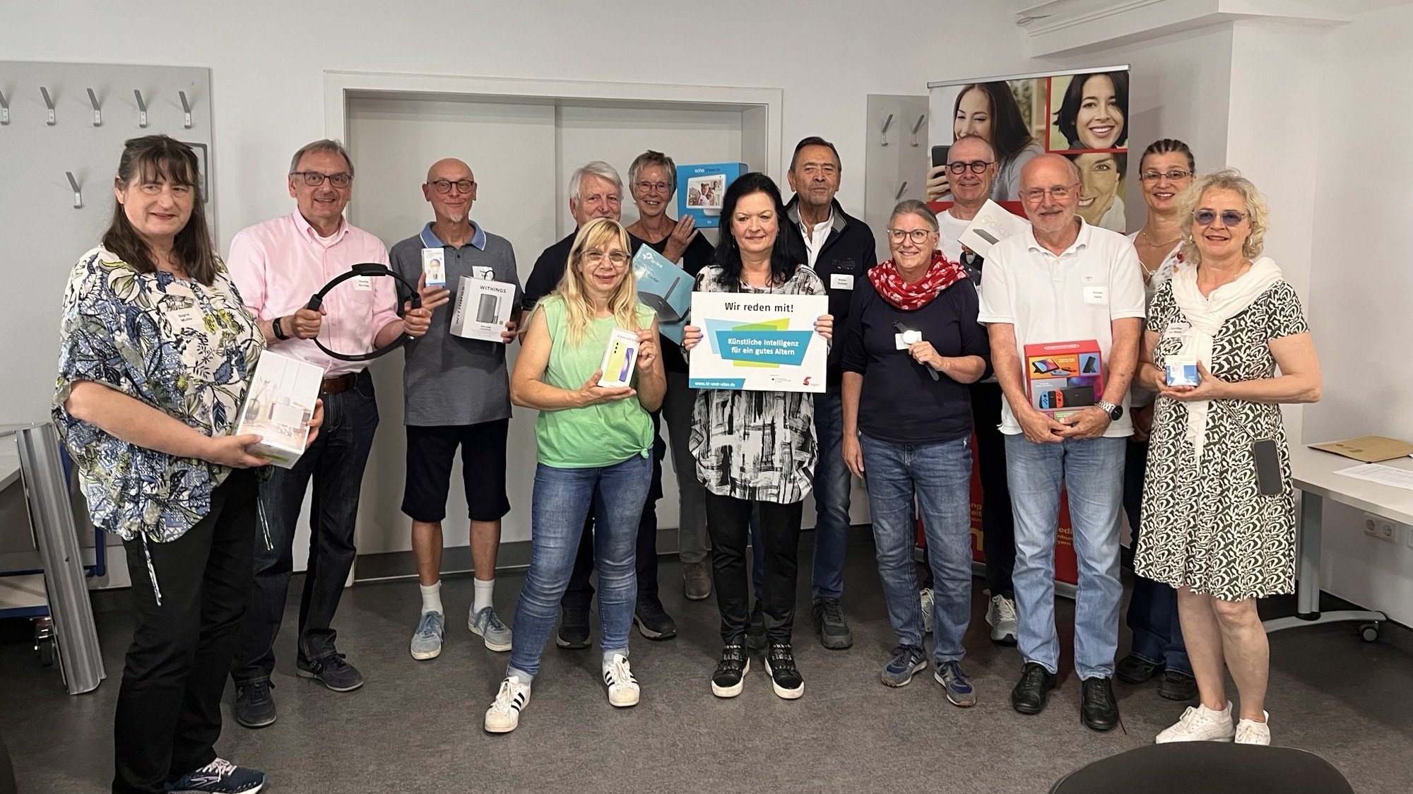 Nach einer kurzen Stärkung mit Getränken und belegten Semmeln, bildeten die Teilnehmenden zweier und dreier Teams und machten sich ans Ausprobieren der Geräte. Dabei fand bereits ein reger Austausch auch zu Einsätzen der Geräte in den unterschiedlichen Bildungseinrichtungen der Teilnehmenden statt. Zum Schluss stellten die Teilnehmenden sich gegenseitig das jeweilige ausprobierte Gerät vor und wiesen dabei auf Vor- und Nachteile bei der Einrichtung hin. Gemeinsam wurden erste spontane Ideen für interessierte ältere Menschen entwickelt, wie eine theoretische Einführung in das Thema Künstliche Intelligenz, KI und Gesundheit (E-Rezept, elektronische Patientenakte, Telemedizin, Gesundheitsapps und Blutdruckmessgerät), Spielenachmittage mit dem Nintendo, KI und Fake News (vor allem die Verbreitung von Fake News durch ältere Menschen in WhatsApp und Co), KI und Cybercrime, KI und Datenschutz. Über die Sommerpause probieren die Engagierten die Geräte aus und entwickeln Konzepte für die Vorstellung der Geräte.