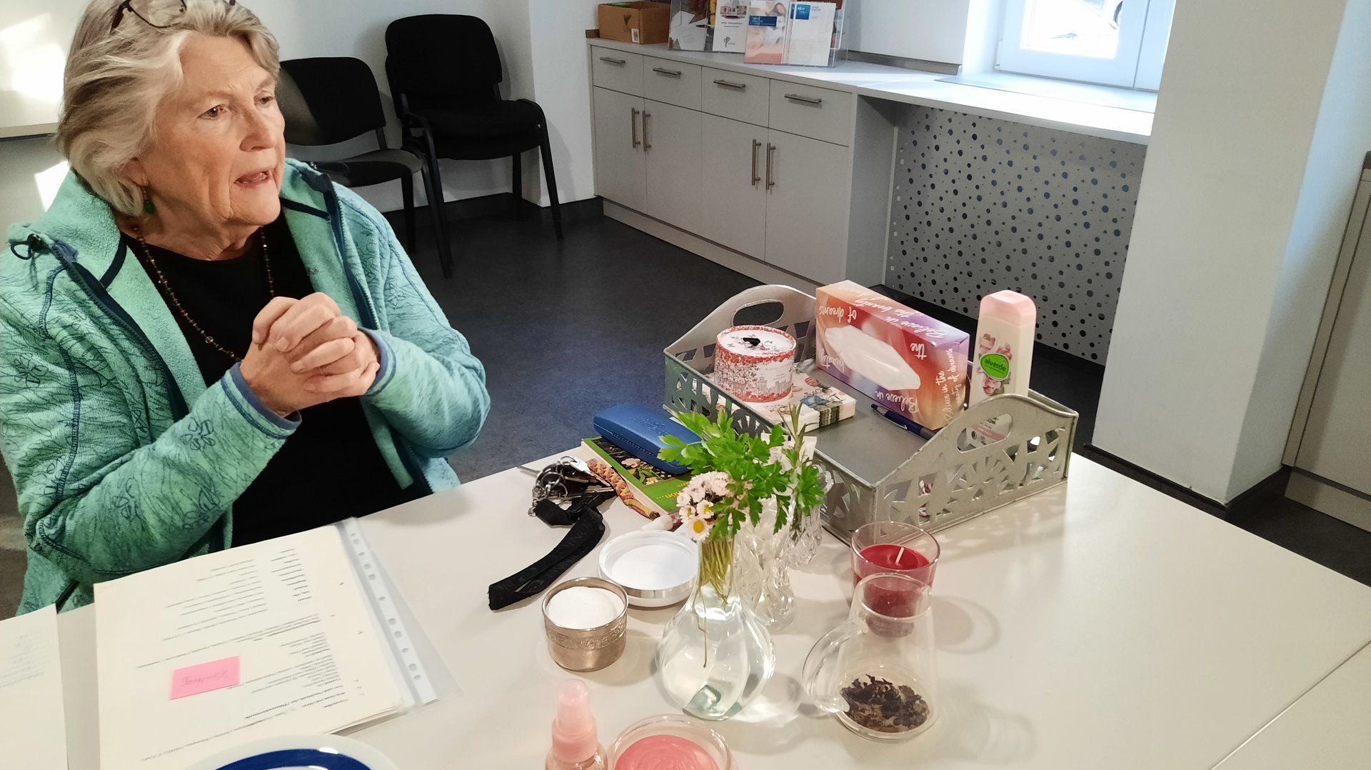 Frau Gertraud Stromer, gelernte Kosmetikerin, erfreute die Mieterinnen am Kufsteiner Platz mit einem Vortrag über Pflanzenkosmetik.