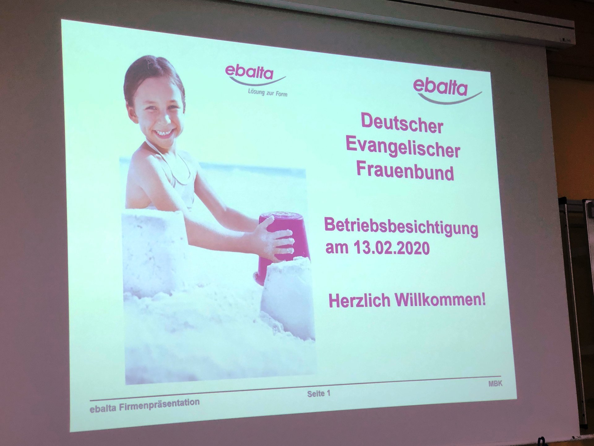 Die etwa 50 interessierten Frauen unseres Ortsverbandes bekamen durch F. Kastner eine rundum gelungene Führung durch das im Industriegebiet gelegene Unternehmen Ebalta. Bereits 1974 wurde es als reines Handelsunternehmen für den Verkauf von Spezialkunstharzen von Ernst Babel mit drei Freunden in der Altstadt gegründet. Weil sich der kleine Betrieb gut entwickelte, konnte schon bald im Industriegebiet ein großes Gelände von 20.000 qm gekauft werden. Darauf haben sich inzwischen sieben große Produktionshallen sowie ein beachtliches Verwaltungsgebäude in der Erlbacher Straße etabliert. Die Mitarbeiterschaft ist bis heute auf 130 Personen angewachsen, die sich aus Büroangestellten, Mitarbeitern im Werkzeugbau, in der Gießerei, im Modellbau, Forschungsbereich und im Entwicklungslabor für die Weiterentwicklung und Anwendung von Kunstharzen zusammensetzt. Das Anwendungsfeld von Kunstharzen ist weit gespannt, die Berufsgruppen sind vielfältig, bei denen Kunstharze zur Anwendung kommen: Vom Schiffs- und Flugzeugbau, über Designer, vom Kulissenbau bis zu Kleinanwendern. Es sind über 2.000 Artikel, die im Programm der Firma zum Kauf angeboten werden. Der Betrieb ist weltweit aufgestellt, internationale Partner sichern in eigenen Lagern die prompte Lieferfähigkeit im jeweiligen Land ab. Ebalta ist ein leistungsstarkes Unternehmen für die Polyurethan- und Epoxidharz-Herstellung weltweit.