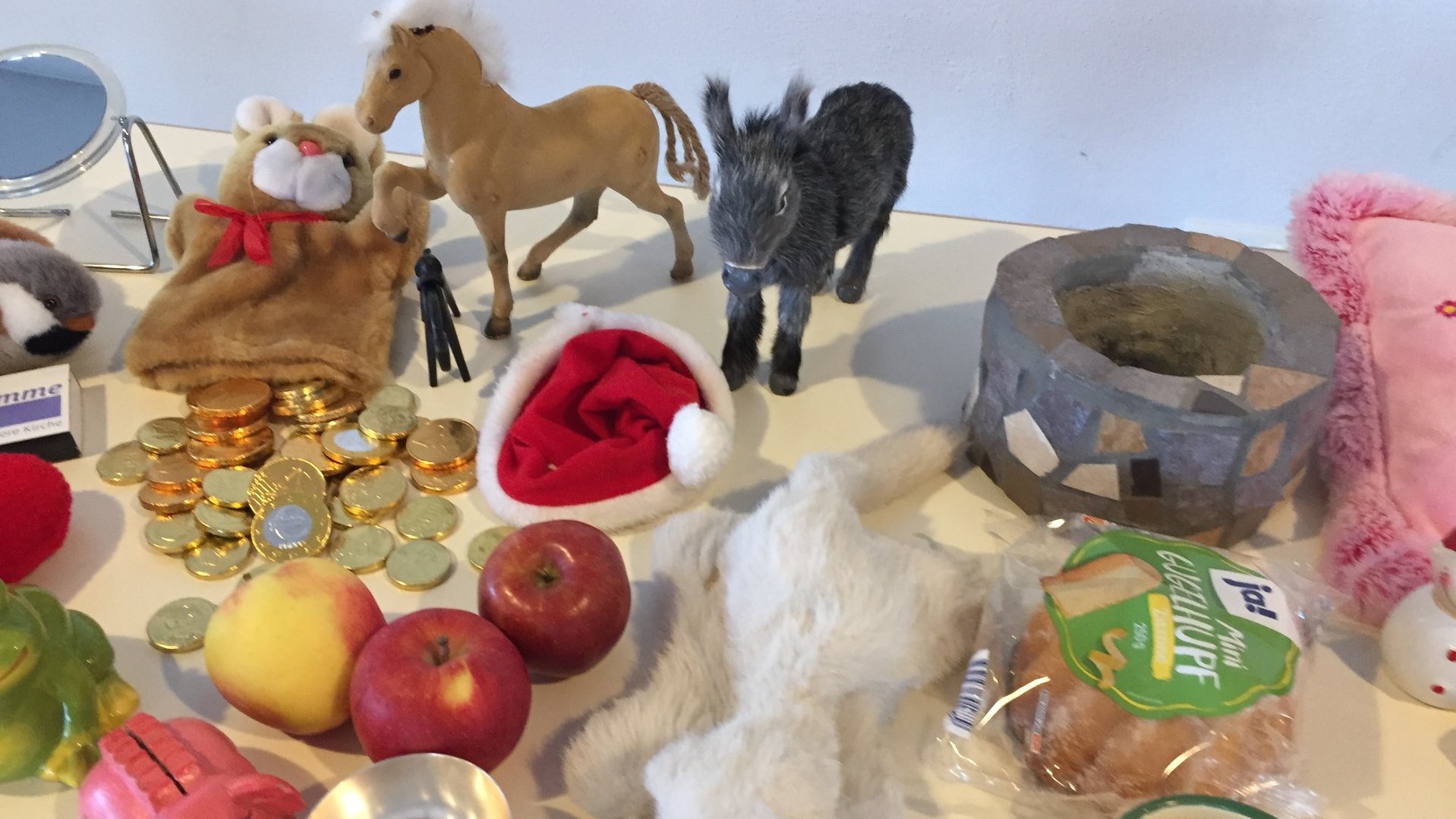 Zur Annäherung an das Thema „Märchen“ betrachteten die Teilnehmerinnen zunächst einen Tisch mit verschiedenen Gegenständen, die alle in irgendwelchen Märchen vorkommen. (siehe Foto) Jede durfte sich 1-2 Gegenstände aussuchen, die sie an ein Märchen denken ließ, das sie als Kind besonders gemocht oder abgelehnt hatte. Anschließend stellte jede ihre Gegenstände vor und es entwickelte sich sofort ein angeregtes Gespräch.