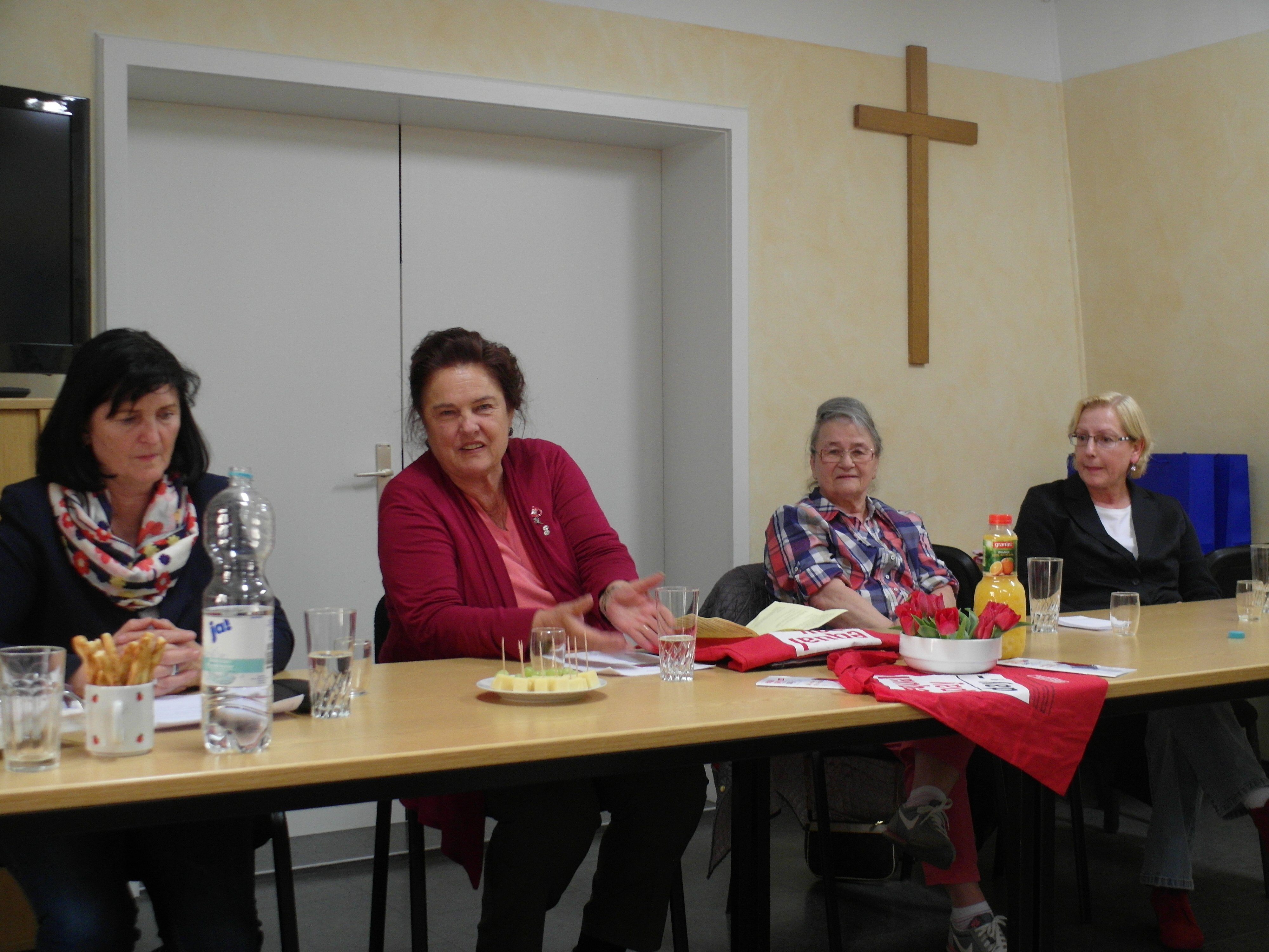 Lydia Klein, Fachlehrerin und Expertin für die Hauswirtschaft und den Verbraucherschutz, sowie Luise Gugel und Gabriele Buchwald für die Krankenpflege schilderten zunächst ihren beruflichen Werdegang, der meist erst nach anderen Tätigkeiten in die Hauswirtschaft bzw. die Krankenpflege führte. Die Krankenpflegeschule, führte Luise Gugel aus, konnten junge Frauen auch erst ab der Volljährigkeit besuchen, und diese trat früher erst mit 21 Jahren ein. Sie habe schon vorher gewusst, dass sie in die Krankenpflege wollte und die Ausbildung begonnen, sobald es dann eben ging. Nach einigen beruflichen Stationen wollte sie ihr Glück auch in München versuchen, wo sie nun seit 42 Jahren lebt. Auch ihre Kollegin Gabriele Buchwald arbeitet seit 30 Jahren in der Krankenpflege. Der Beruf ist sehr verantwortungsvoll, aber der Druck ist sehr gestiegen und die Zeit knapp bemessen. Für das persönliche Gespräch mit Patienten bleibt kaum Zeit. Die Arbeit wird auch von manchen in Teilzeit ausgeübt, was aber vor allem die Stationsleiterinnen bei der Einteilung vor Probleme stellen kann. Denn wenn Pflegerinnen und Pfleger nicht für die drei Schichten eingeteilt werden können wie die voll angestellten Kolleginnen und Kollegen, sondern nur von dann bis dann arbeiten können, müssen andere die fehlenden Stunden bis Schichtende oder ab Schichtbeginn übernehmen. Im Krankenhaus auf den einzelnen Abteilungen ist der Betrieb mitunter sehr hektisch, man muss einen kühlen Kopf bewahren. Alle müssen sich aufeinander verlassen können. Dass das möglich und üblich ist, wissen alle Seiten zu schätzen, auch die Ärzteschaft.
