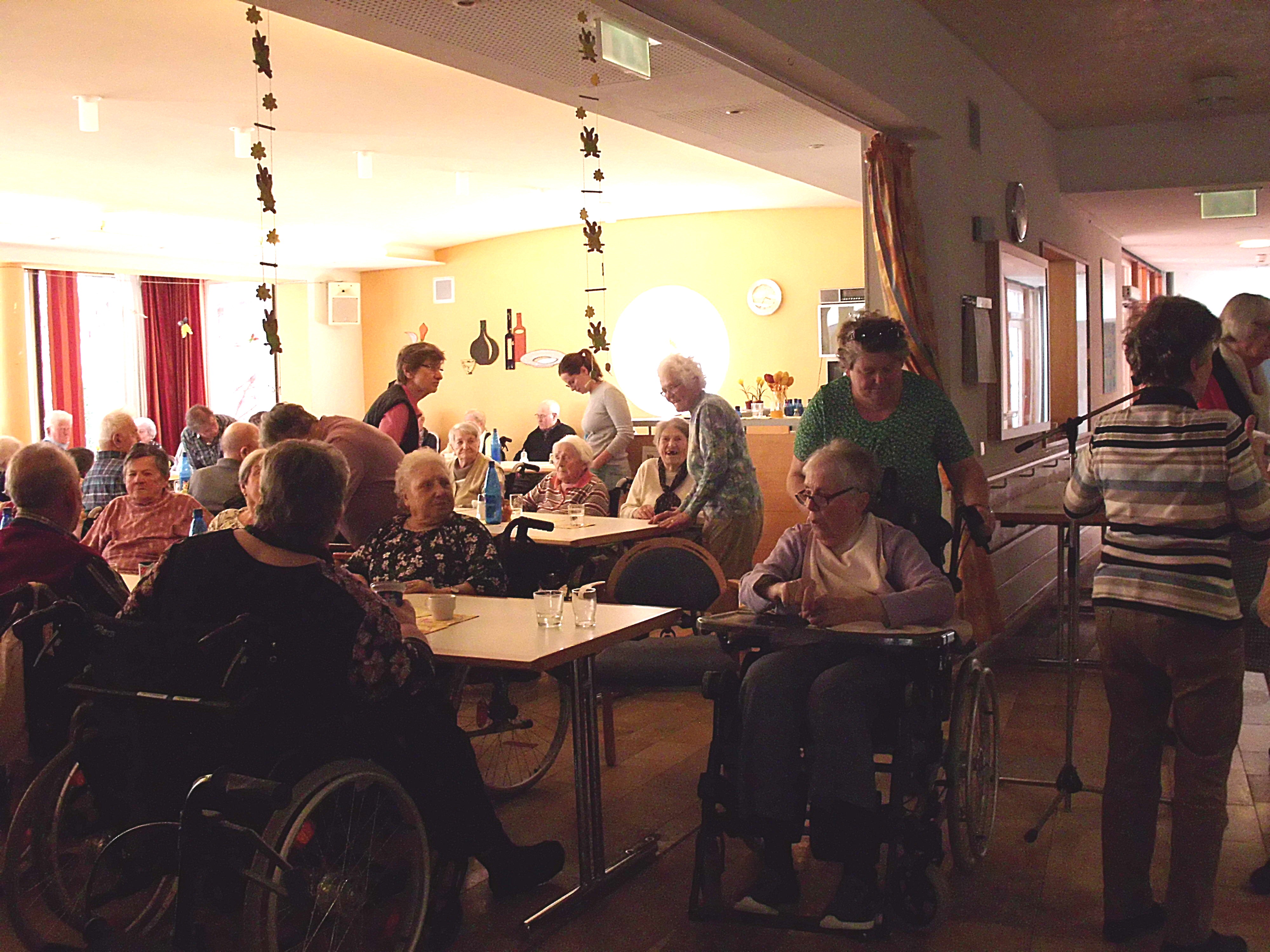 Bei Bauerntorte und Kaffee im festlich geschmücktem Saal konnte der Nachmittag beginnen. Der Saal war bis zum letzten Platz gefüllt. Frau Schlumprecht, selbst eine Bewohnerin und langjähriges Mitglied im DEF, begleitete die Vorleserinnen bei Liedern am Klavier. Mit dem Lied „auf der Schwäb'schen Eisenbahn“, welches alle in Hochstimmung brachte endete der wunderschöne Tag.