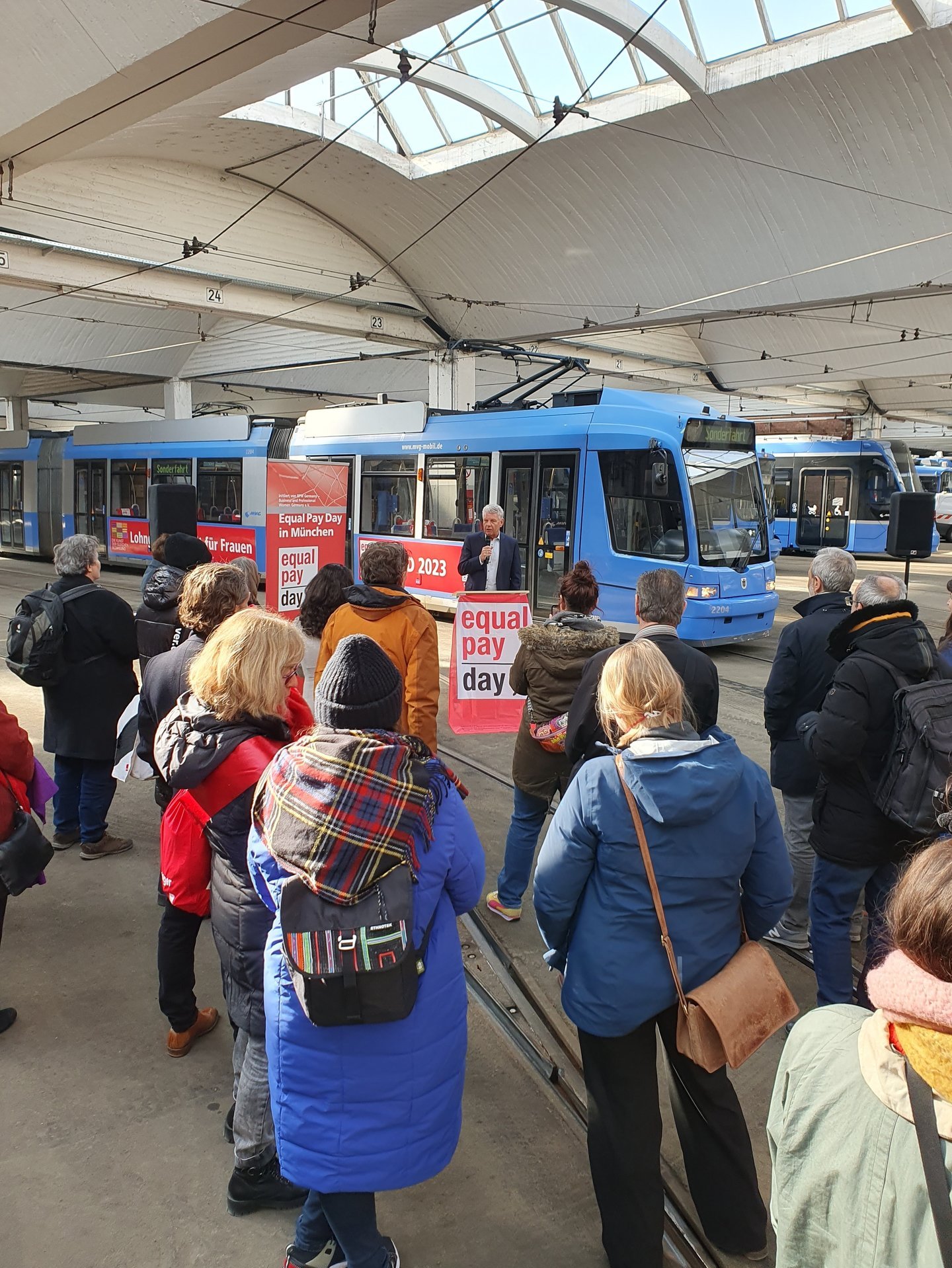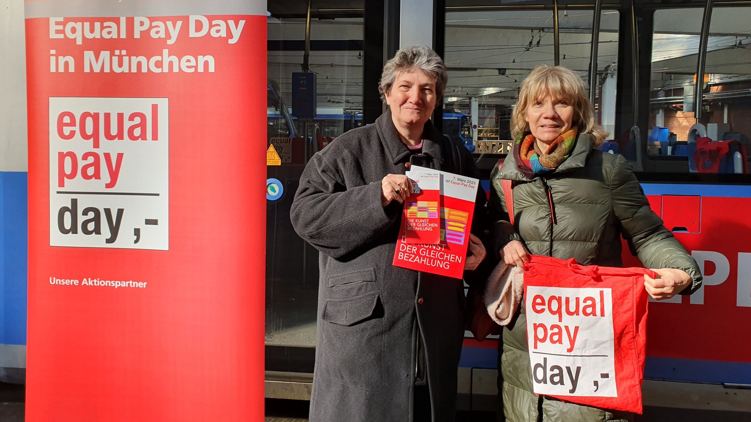 In München lässt ein breites Aktionsbündnis von über 40 Frauenorganisationen den gesamten März eine „Equal Pay Day“-Tram die Forderung nach Lohngerechtigkeit für Frauen durch die Stadt fahren. Die Münchner Ortsverbandsvorsitzende des Deutschen Evangelischen Frauenbundes Dr. Bettina Marquis und ihre Stellvertreterin Maren Puls waren bei der Auftaktveranstaltung mit dem Oberbürgermeister Dieter Reiter mit dabei (im Bild: vl. B. Marquis, M. Puls)