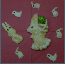 Hefeteig herstellen, nach dem Gehen ca. 1/2 – ¾ cm dick auswellen und Formen ausschneiden. Mit Eigelb (verdünnt) bestreichen und backen.