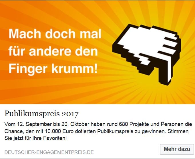 Dienstag, 12.September, bis Freitag, 20.Oktober 2017 online auf www.deutscher-engagementpreis.de abstimmen.