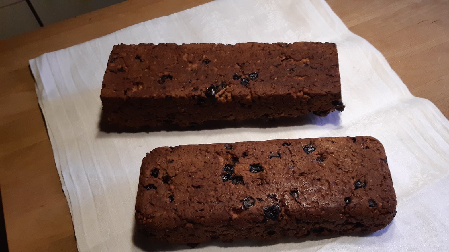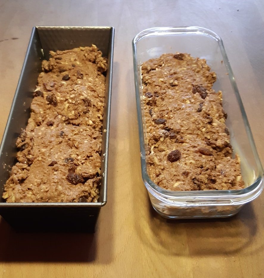 Alle weiteren Zutaten am nächsten Tag gut miteinander mischen, eine Kastenform fetten oder mit Backpapier auslegen, Teig einfüllen und bei 190 ° ca. 60 Min. backen.