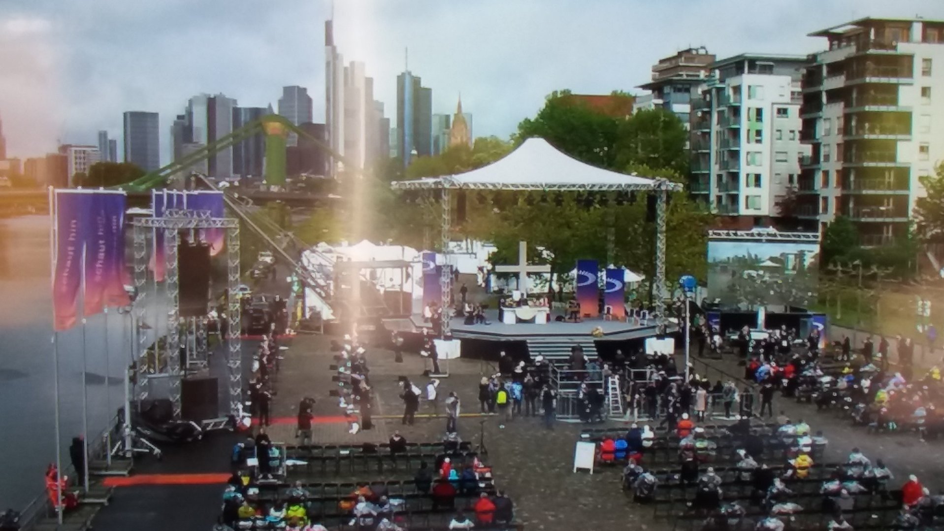 Hatte man genug von den Gesprächen, machte man sich auf einen virtuellen Spaziergang durch Frankfurt zu den Buchstaben: „S C H A U T H I N „dem Motto des Kirchentages, die verteilt über die ganze Stadt, z.B. Römer, Paulskirche und Alte Oper, auch mit den Sehenswürdigkeiten von Frankfurt bekannt machen. Beginnend am Hauptbahnhof mit dem „S“, wo die Gäste ankommen (sollen). Dazu finden wir in der Stadt, an der Hauptwache, große und kleinere blaue Tische, die getrennt nebeneinander stehen, aber wir können uns die Hände über die Spalten hinweg reichen. Wie auch bei den gemeinsamen Bibelarbeiten, den Gottesdiensten und auch beim Abendmahl und der Eucharistie. Wenn es auch keinen gemeinsamen Abendmahls-Eucharistiegottesdienst gab, so gab es in den getrennt konfessionellen Gottesdiensten doch die von Jesus ausgesprochenen Einladung an Gläubige auch der anderen Konfessionen am Mahl teilzunehmen. Und im Abschlussgottesdienst wurde von der katholischen Predigerin der Zugang von Frauen zu allen Ämtern der Kirche gefordert. Der gemeinsame Friedensgruß, der von allen Teilnehmenden in die Welt getragen werden sollte, beendete den Kirchentag.