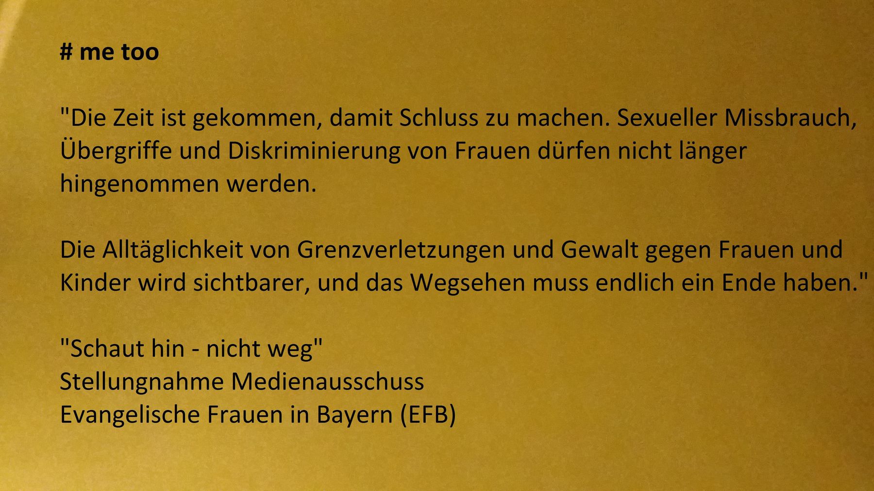 Der Medienausschuss der Evangelischen Frauen in Bayern (EFB), in dem vor allem Mitglieder des Deutschen Evangelischen Frauenbundes und seiner Evangelischen Arbeitsgemeinschaft Medien vertreten sind, fühlt sich dem Grundsatz eines herrschaftsfreien Miteinander der Geschlechter verpflichtet und fordert deshalb alle gesellschaftlichen Bereiche auf: Schaut hin – nicht weg!
