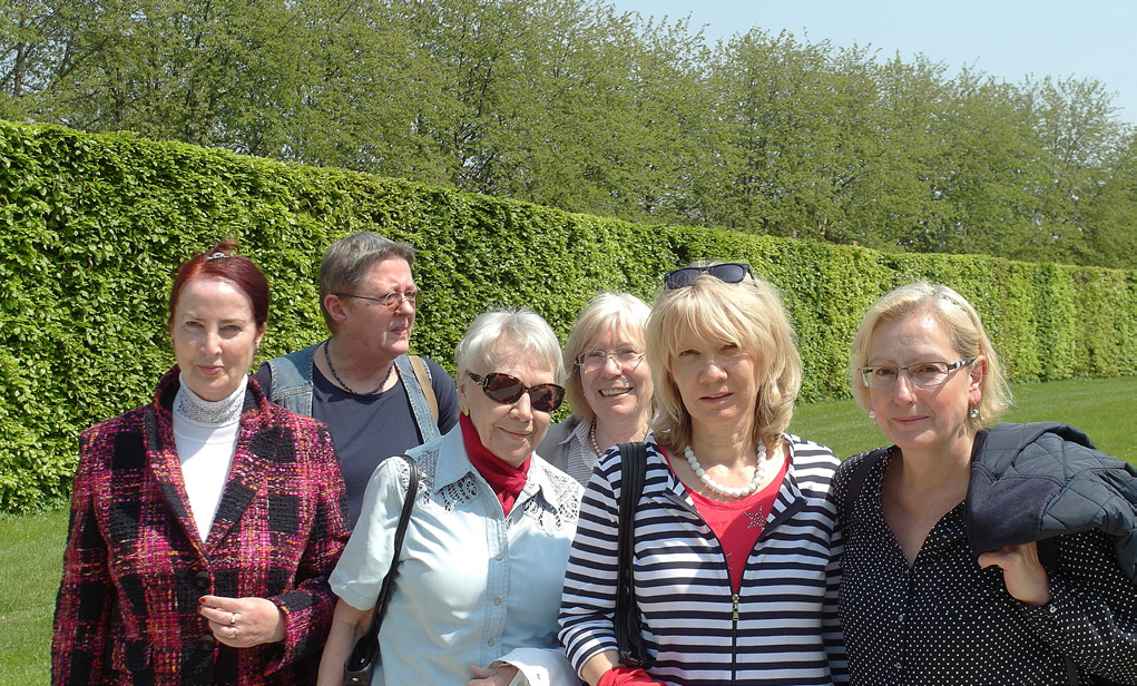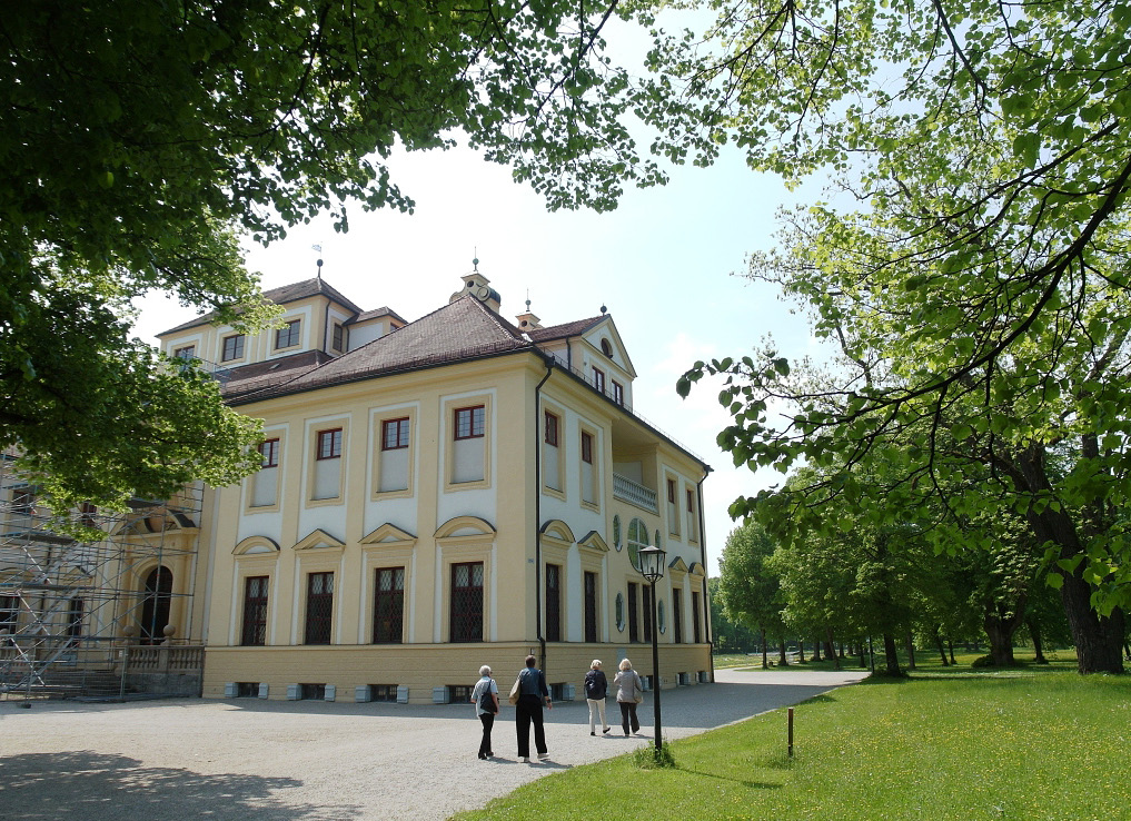 Schleißheim ist in erster Linie bekannt für sein prachtvolles Schloss, das den europäischen Rang seines Bauherrn Max Emanuel unterstreichen sollte. Luftiger wirkt die Gartenseite, wo ein Kanal mit beiderseitigen Wegen gesäumt eine Sichtachse bildet. Das Ensemble umgibt ein Landschaftspark. Diesen durchquerten die Teilnehmerinnen zügig, denn Mittagessen und Besuch der Porzellansammlung standen auf der Seite von Lustheim am anderen Ende der Schlossanlage auf dem Programm.