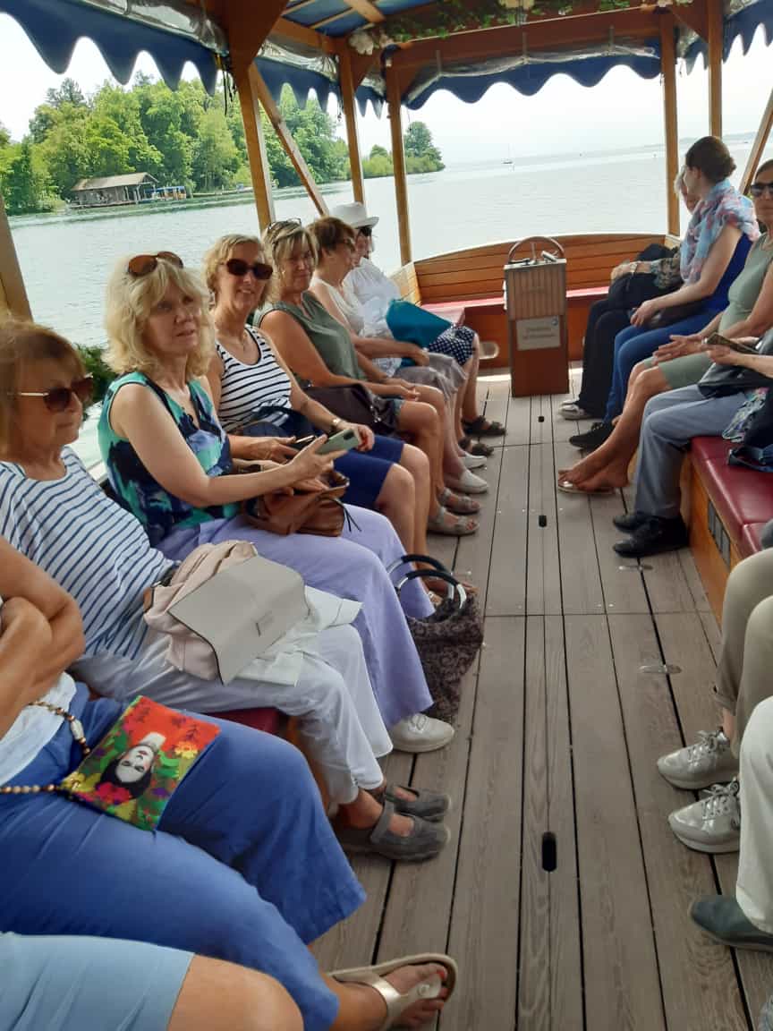 entlang des Starnberger Sees zur Anlegestelle einer Fähre. Sie ist der einzige Weg, um zur Roseninsel zu kommen mittels eines elf Meter langen, flachen Holzbootes, genannt die „Zille“. Einzigartig ist auch der vollbärtige Fährmann in bestickter Lederhosn und Trachtenhut, der Damen galant über die wackelige Rampe führte mit einem „Grüß Gott die Damen“. Die kurze Überfahrt garnierte er mit amüsanten Geschichten über Brautpaare, die auf der Roseninsel standesamtlich heiraten können und dabei eines, oh mei! vor der Trauung ins Wasser fiel. „Die haben wir a no verheiratet“ sagt er lachend. Die fröhliche Bootsreise endete auf dieser kleinen, idyllischen Insel.