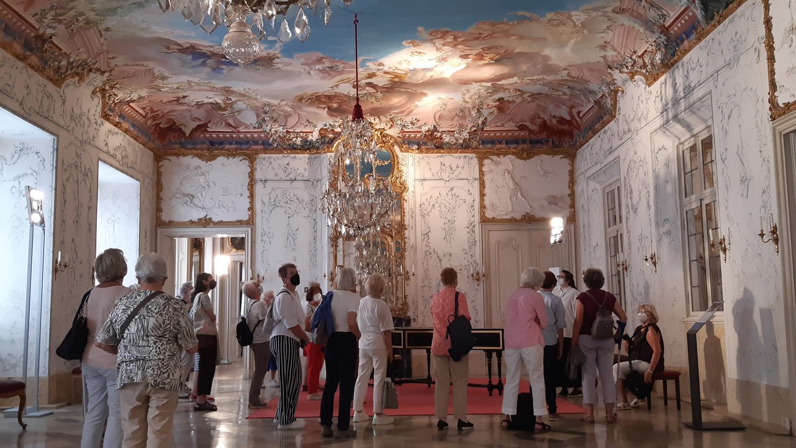 Nach der Mittagspause in einem schattigen Biergarten stand Schloss Seehof in Memmelsdorf bei Bamberg auf dem Programm. Schloss Seehof wurde ab 1686 als Sommerresidenz der Bamberger Fürstbischöfe nach Plänen von Antonio Petrini errichtet. Ende des 20. Jahrhunderts wurden umfangreiche Sanierungsmaßnahmen durchgeführt. So sind nun neun Schauräume des restaurierten Appartements der Fürstbischöfe für Besucherinnen und Besucher sind zugänglich, darunter der "Weiße Saal". Wegen Restaurierungsarbeiten waren Teile der Schlossanlage und des Schlossgartens gesperrt, aber die Führung in den angenehm kühlen Räumen war überaus interessant und beeindruckend.