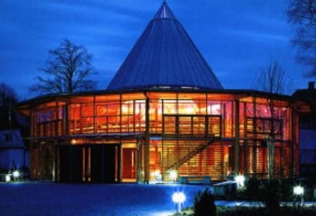 Gisela Stübing Bild: Segenskirche Holzkirchen, abends, von dem lesenswerten Architekturporträt der Segenskirche auf der Website holzkirchen-evangelisch