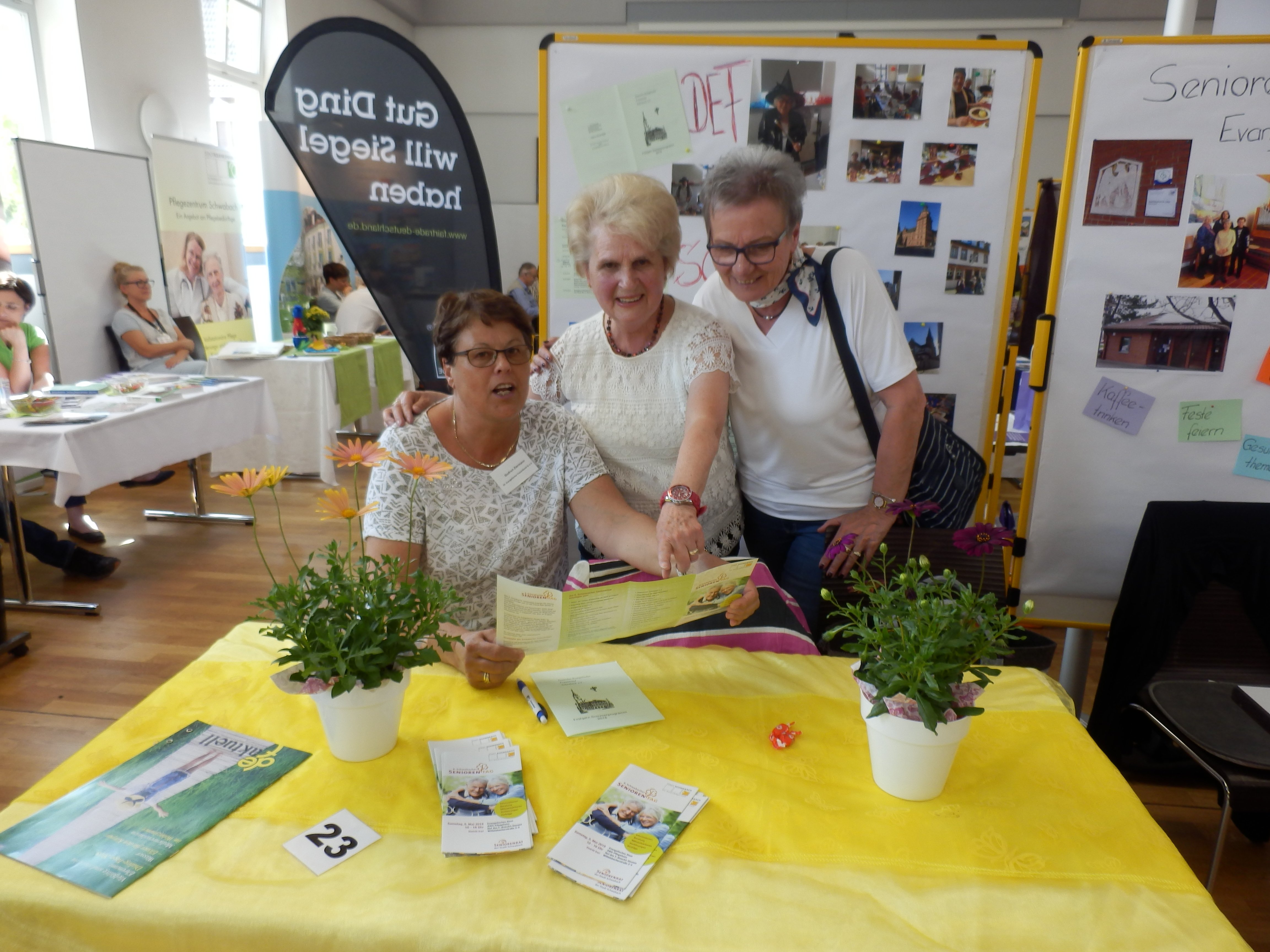 Ein voller Erfolg war der 6. Schwabacher Seniorentag im Evangelischen Haus in der Wittelsbacher Str. 4 in Schwabach, an dem sich der Deutsche Evangelische Frauenbund beteiligte. Der DEF Stand war in aufmunterndem Zitronengelb gehalten und mit Blumenstöcken und dem DEF Banner dekoriert und zog mit seiner mediterranen Atmosphäre zahlreiche Besucherinnen und Besucher zum Gespräch an.